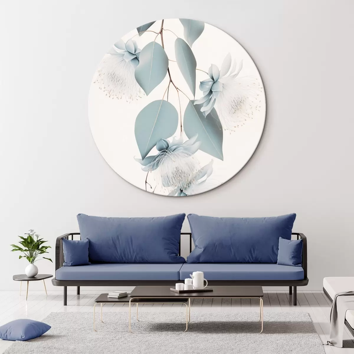 Obrázok Vetva eukalyptu s modrými listami a bielymi kvetmi, svetlé pozadie Nr r45947