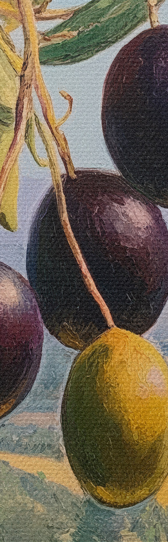 Obrázok Olivová ratolesť s tmavými plodmi na pozadí letnej krajiny Nr r46150