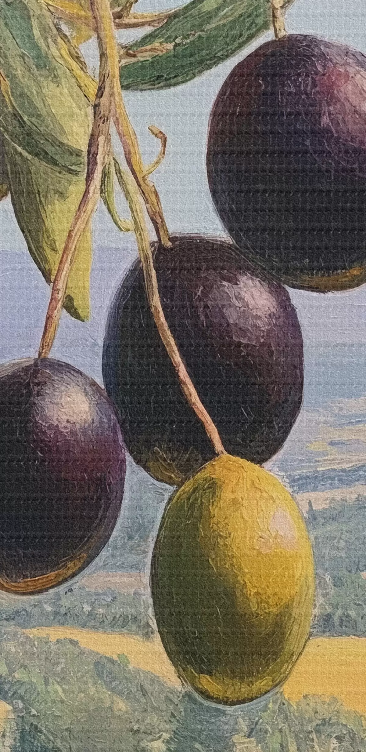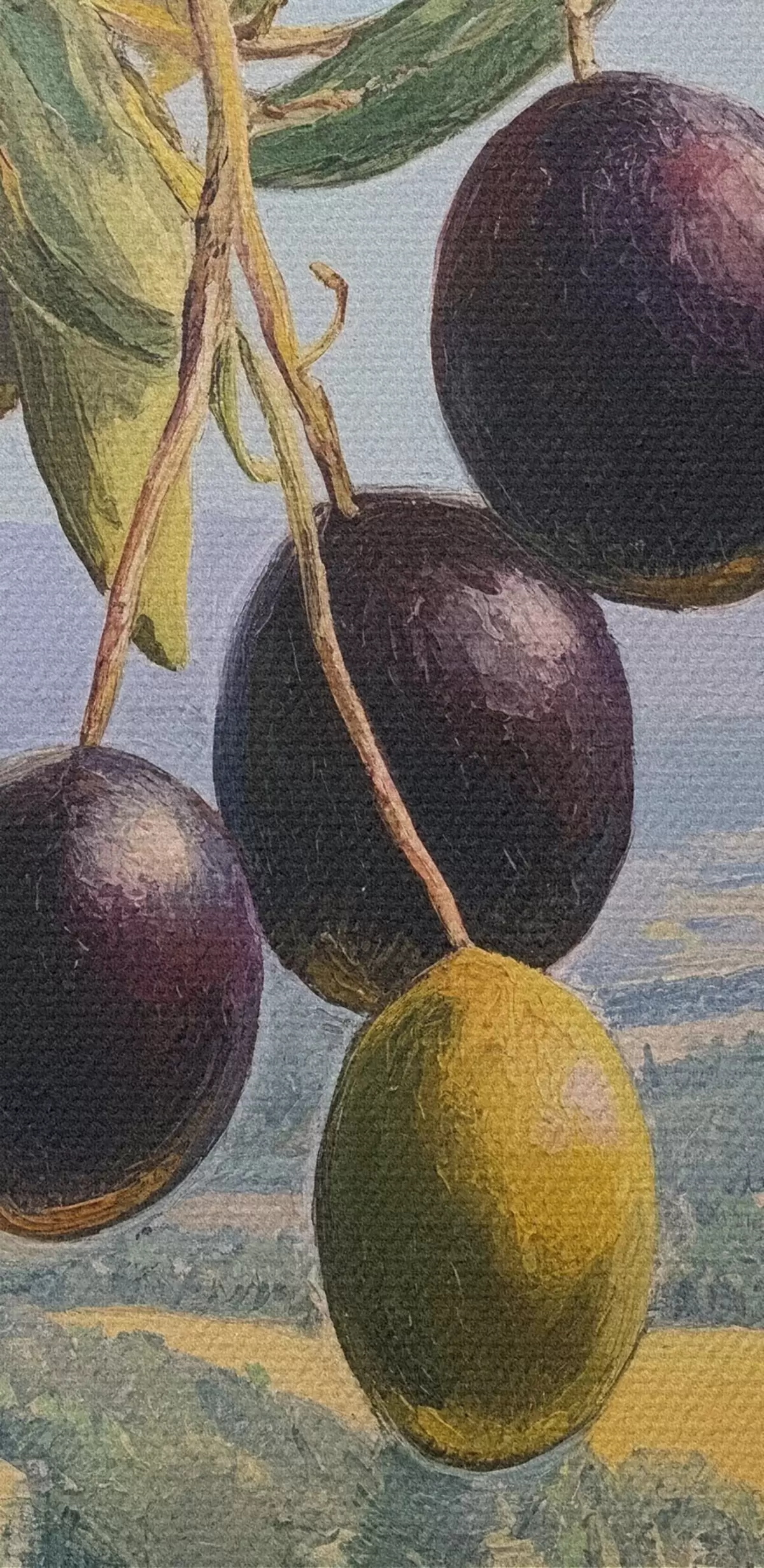 Obrázok Olivová ratolesť s tmavými plodmi na pozadí letnej krajiny Nr r46150