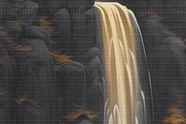 Obrázok Skalnatá krajina s vodopádom v teplých farbách západu slnka Nr r46177
