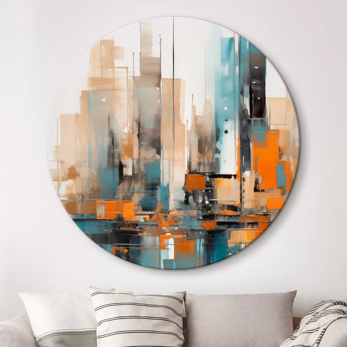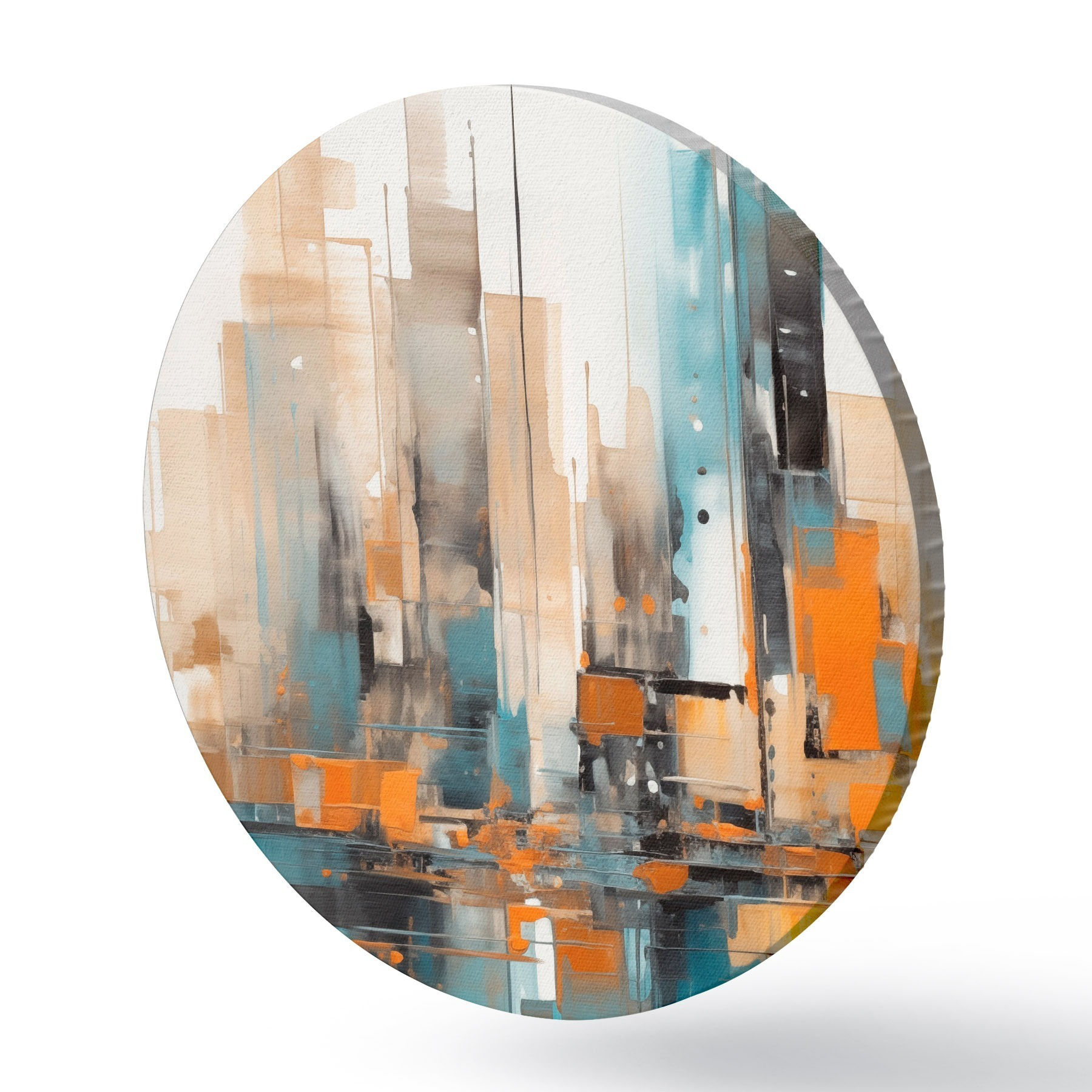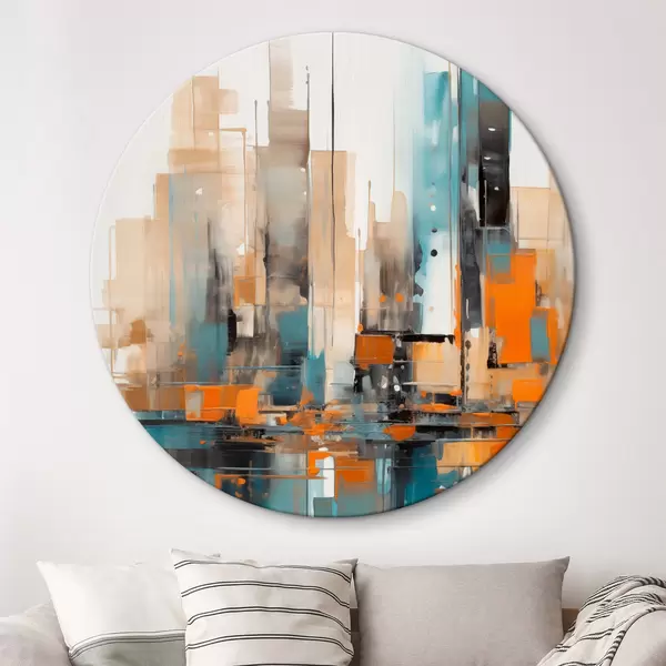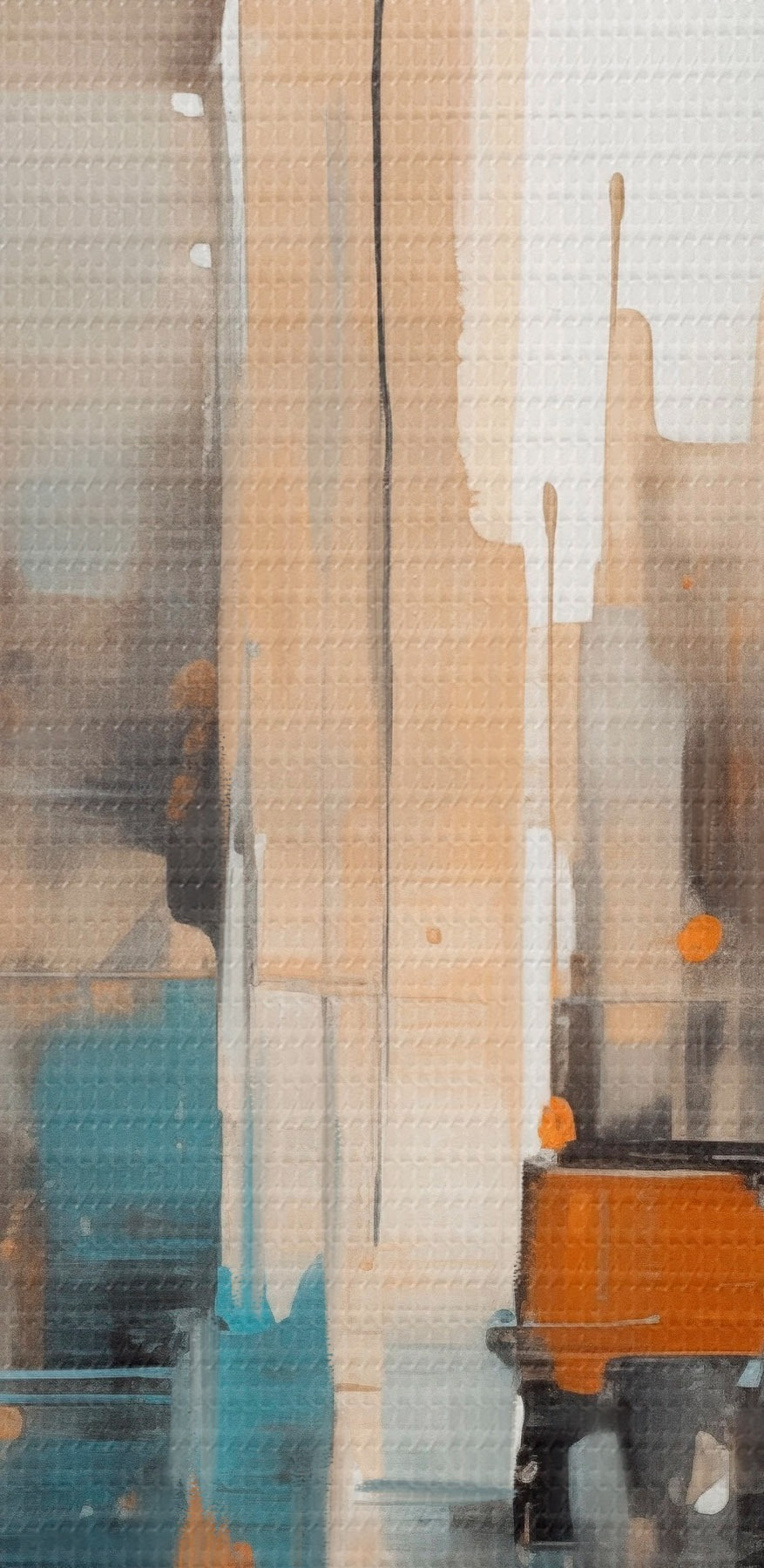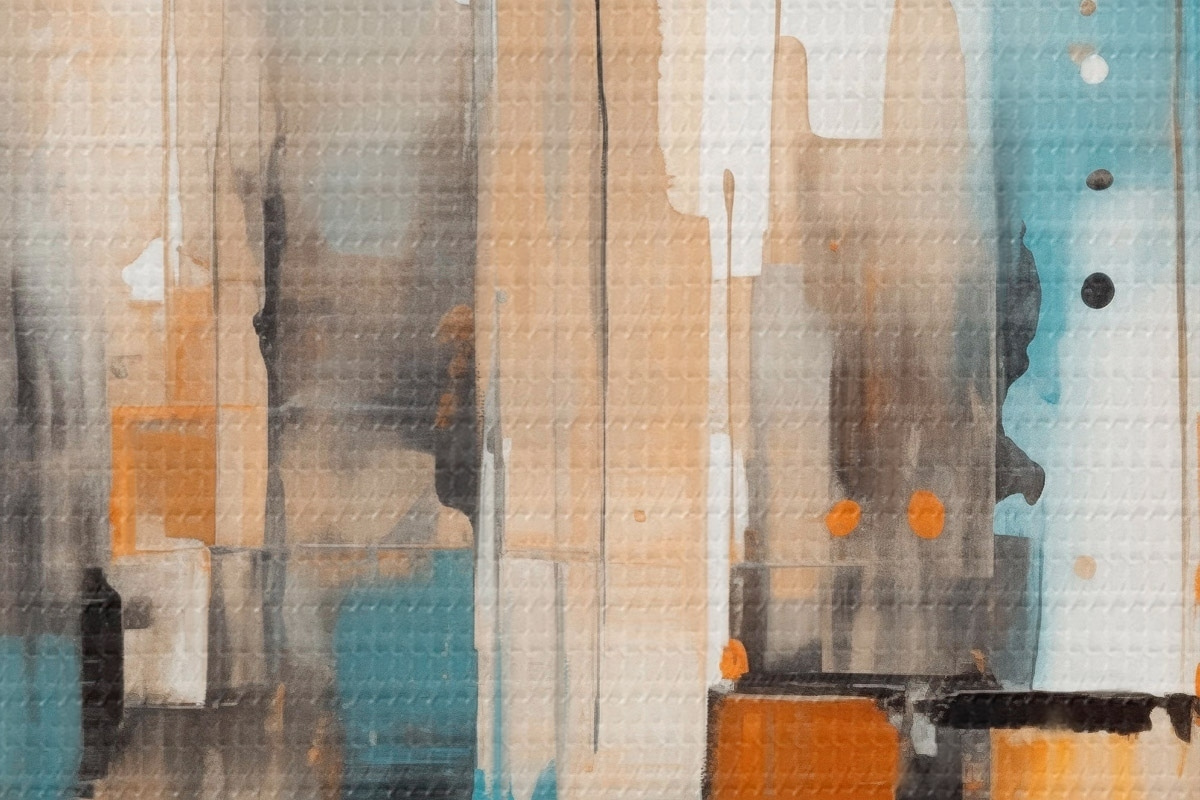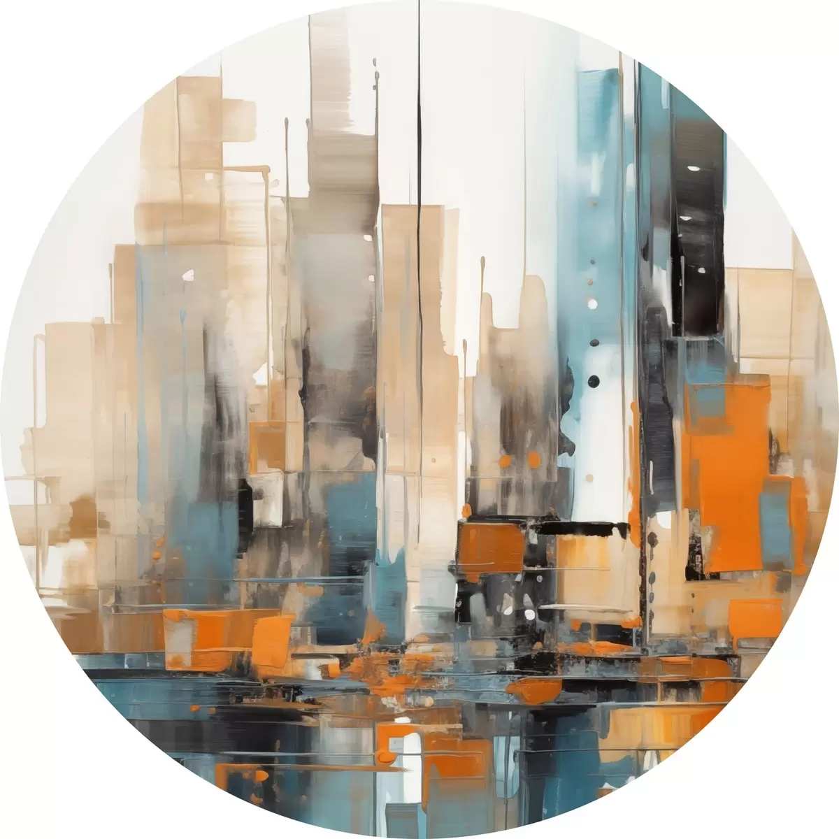 Obrázok Abstraktný mestský panoráma s oranžovými, tyrkysovými a hnedými vertikálnymi ťahmi štetcom a geometrickými tvarmi Nr r46266