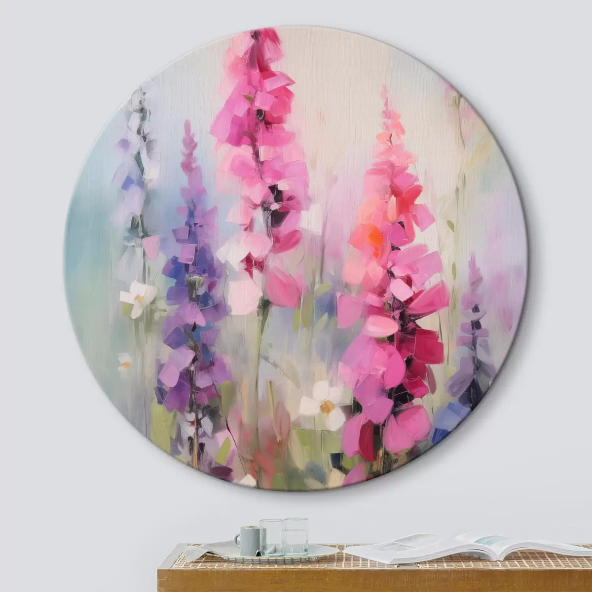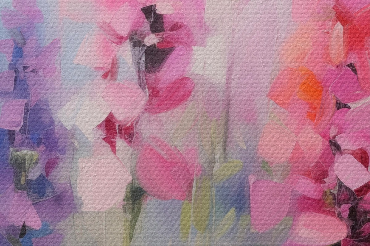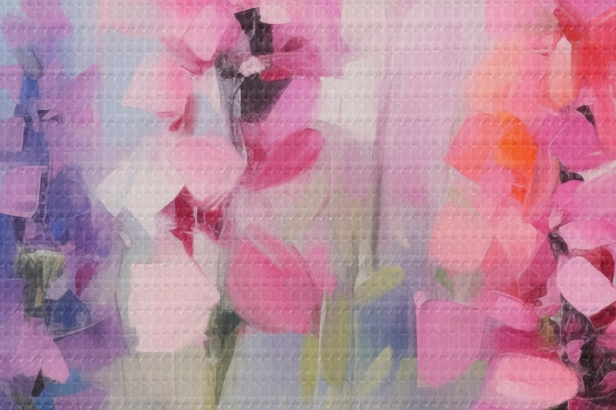 Obrázok Ružové a fialové kvety s bielymi sedmokráskami na poli, jemné ťahy štetcom, pastelové farby, impresionistický štýl Nr r46279