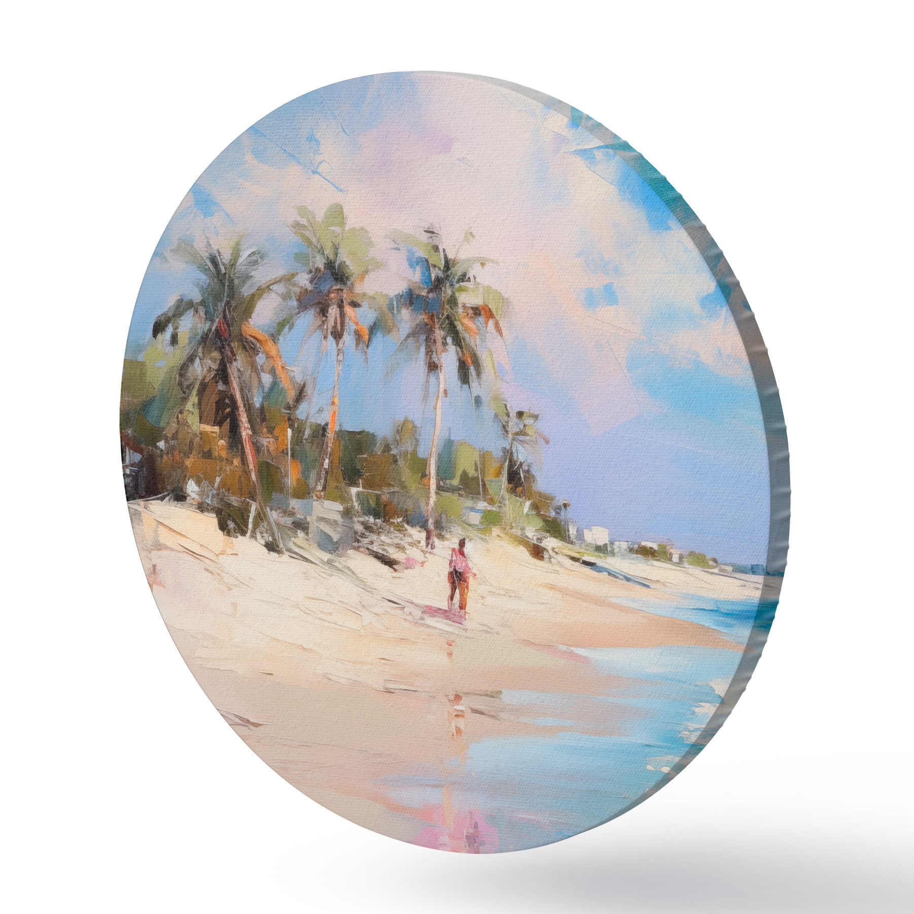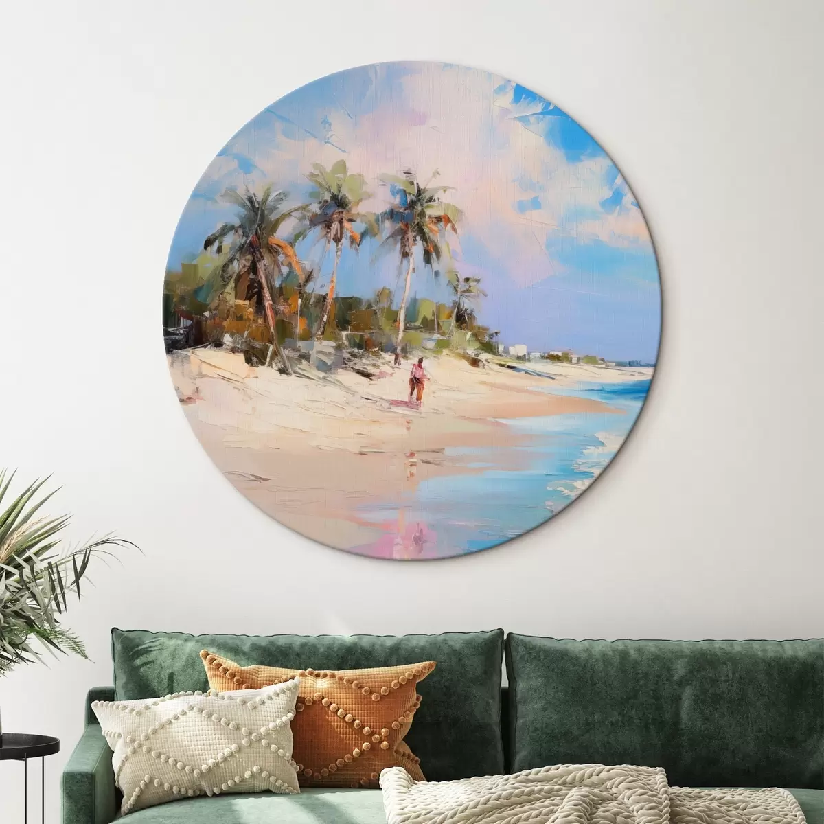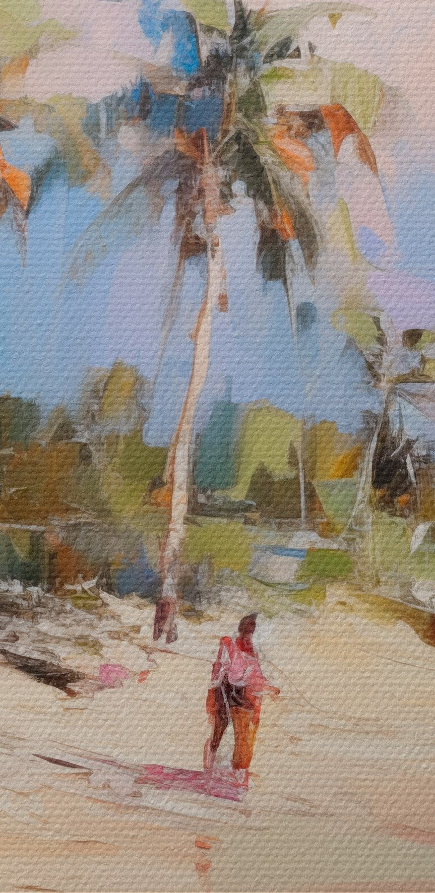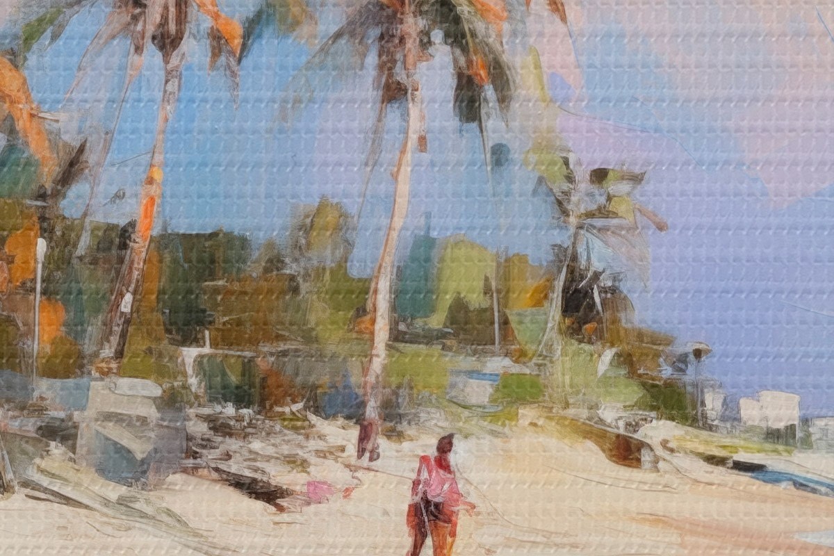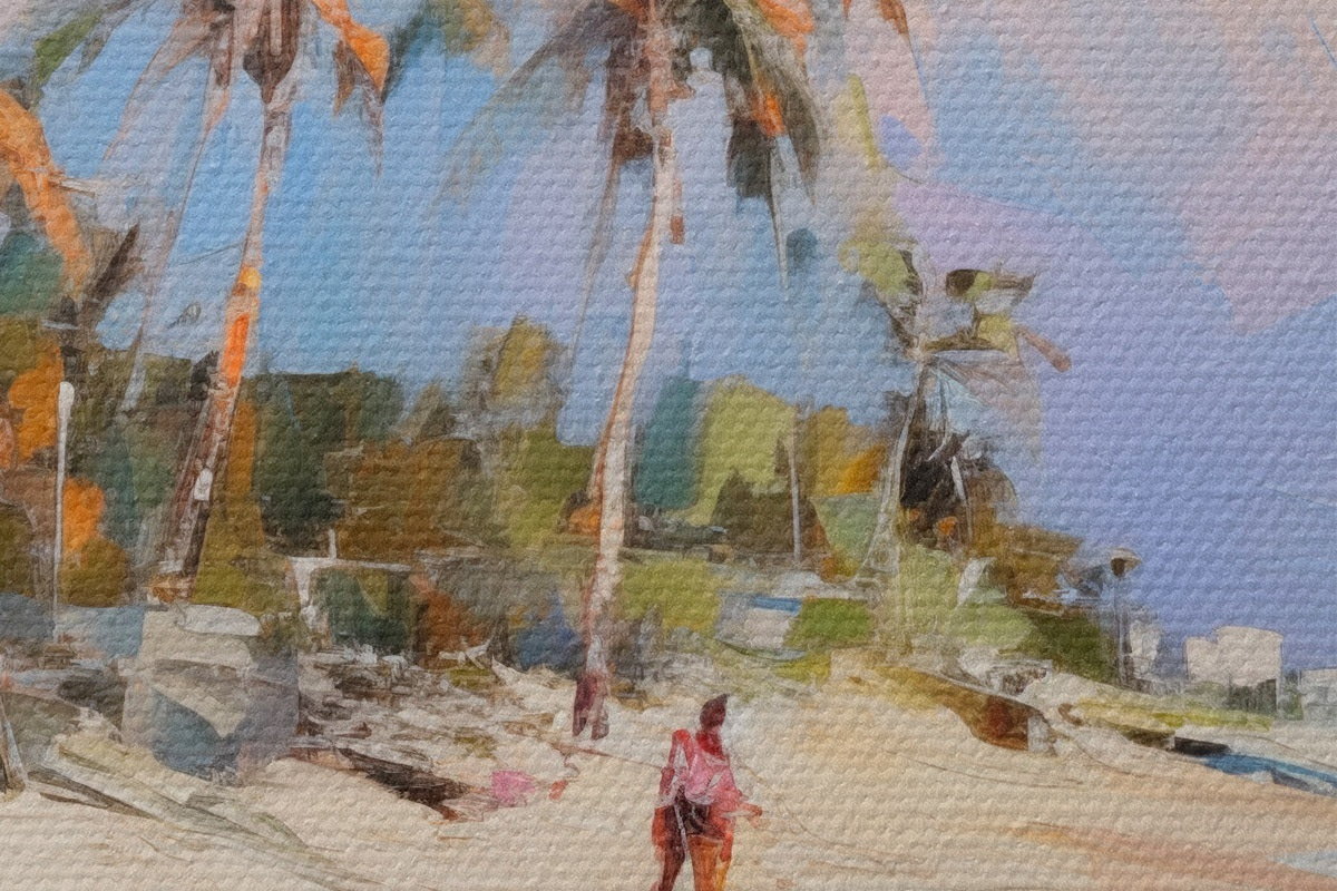 Obrázok Abstraktná krajina, pláž s palmami, jasný slnečný deň s modrou oblohou a niekoľkými mrakmi Nr r46284