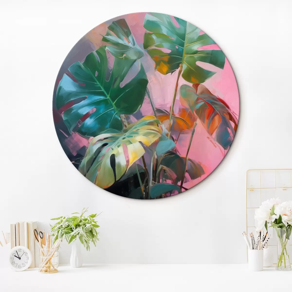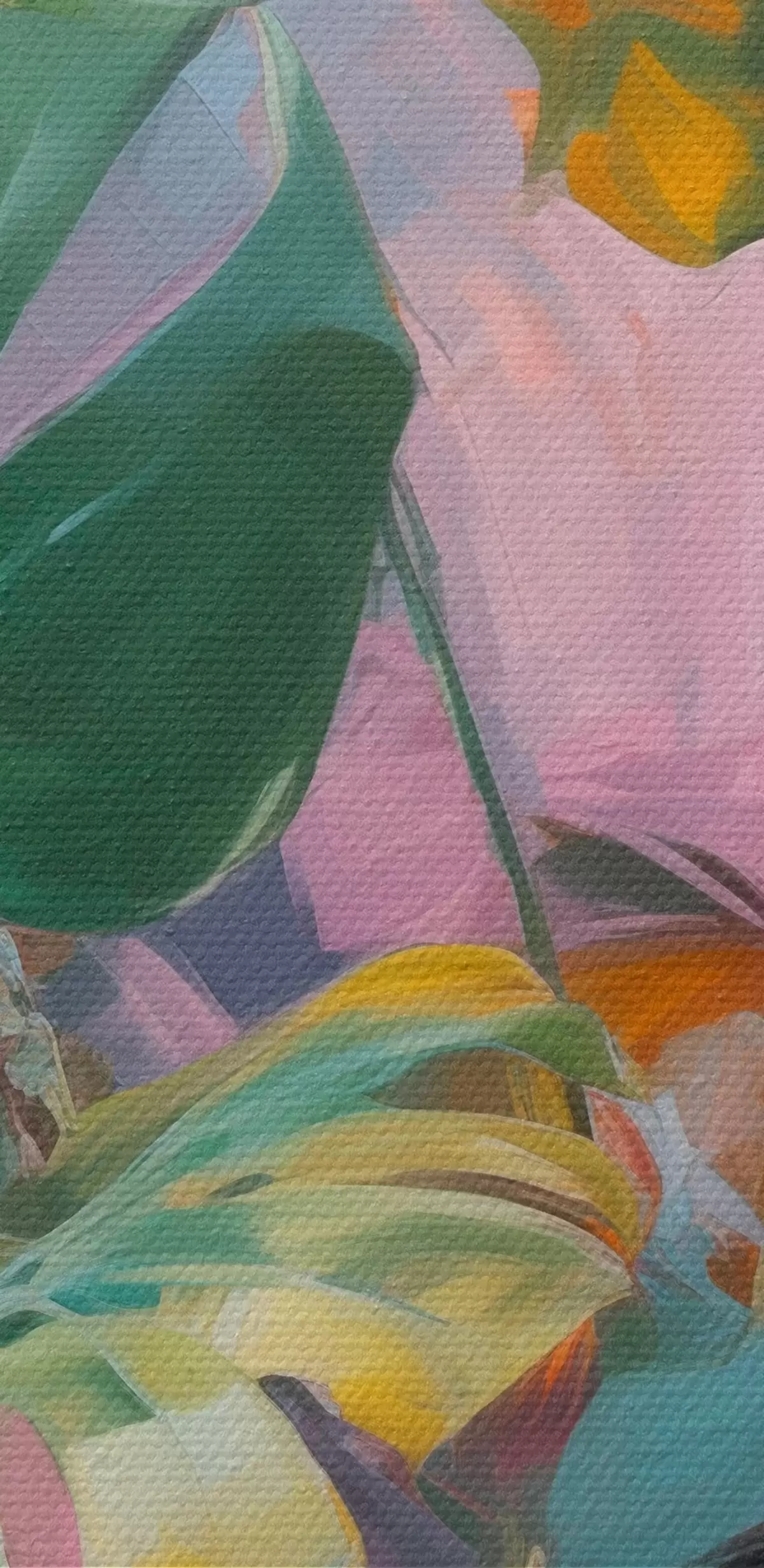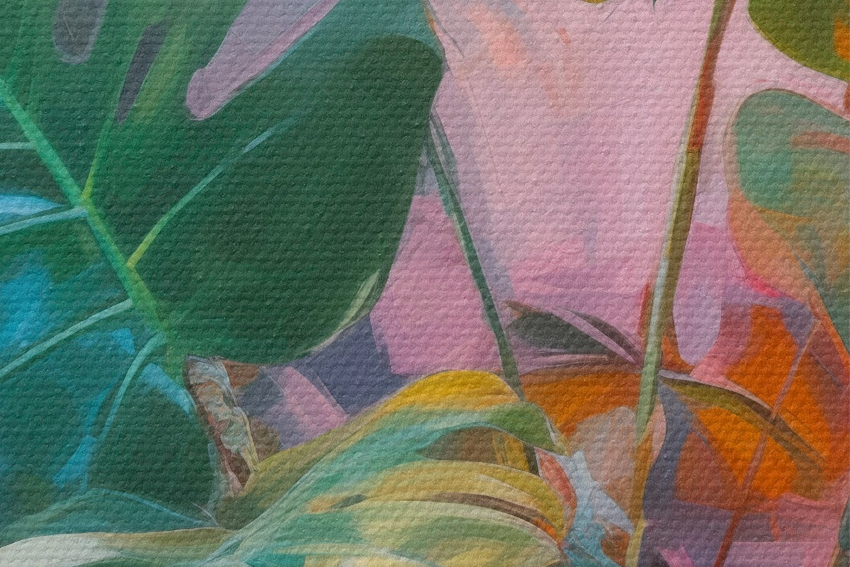 Obrázok Abstraktná rastlina monstera s jasne zelenými listami na pozadí jemných ružových a fialových odtieňov Nr r46286