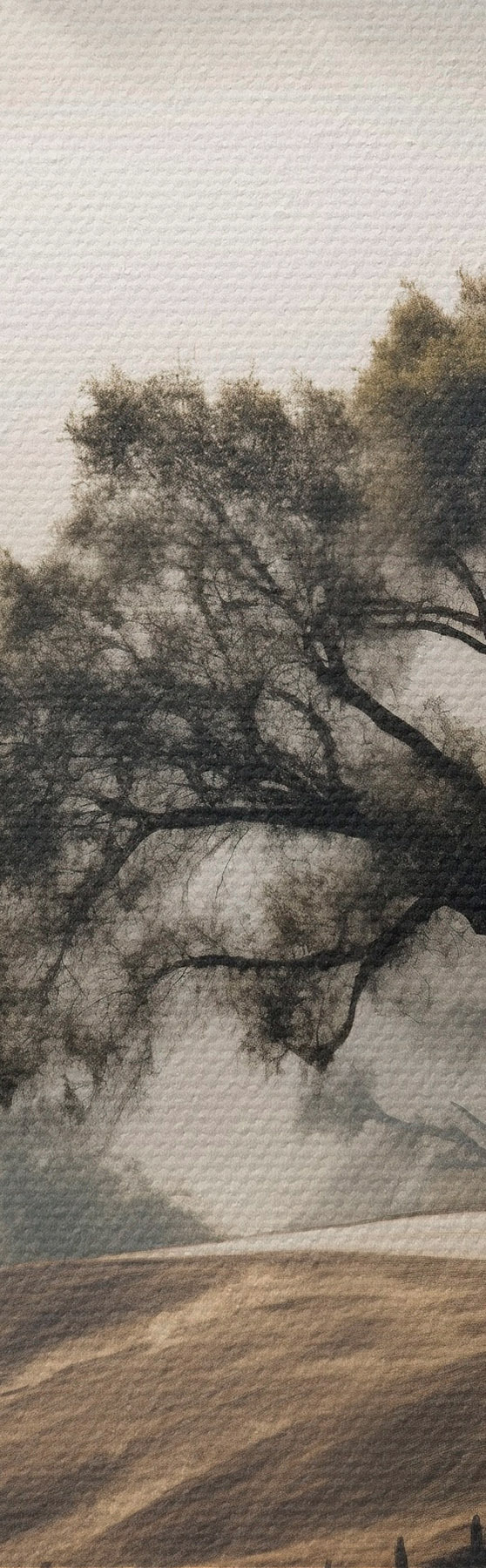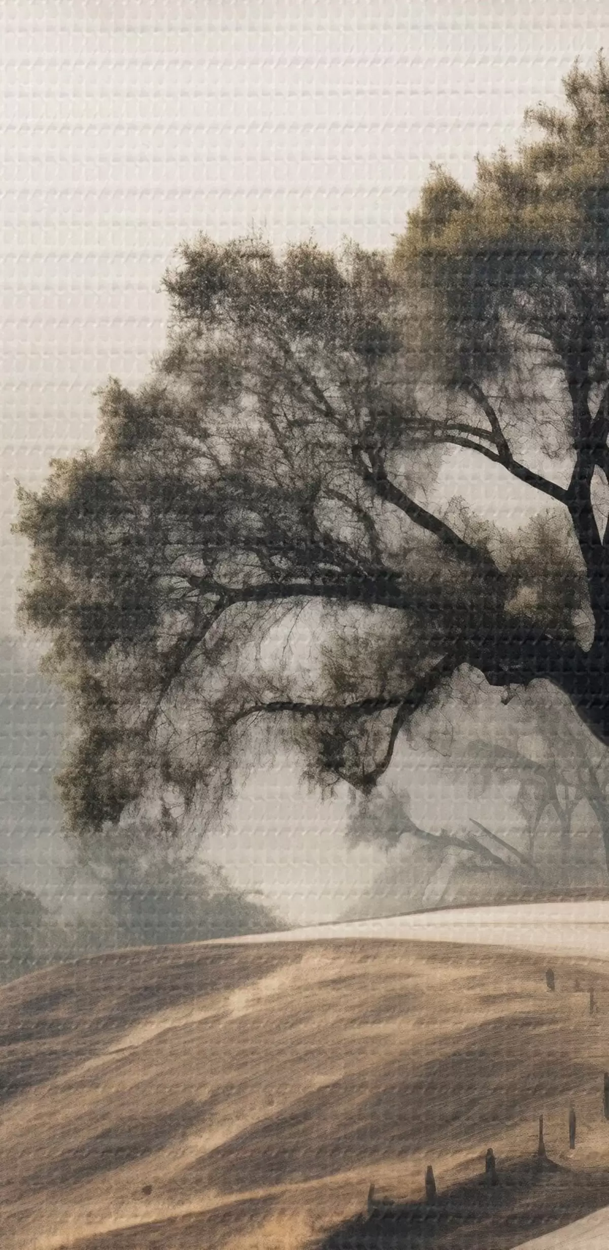 Obrázok Kľukatá cesta cez zvlnené kopce s stromom v popredí, v pozadí hmla a hory Nr r46288
