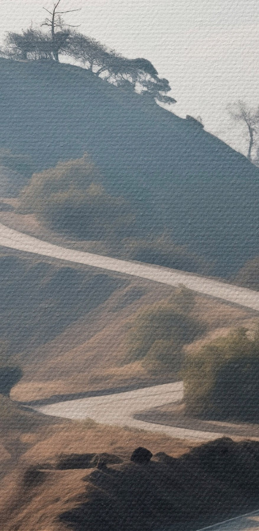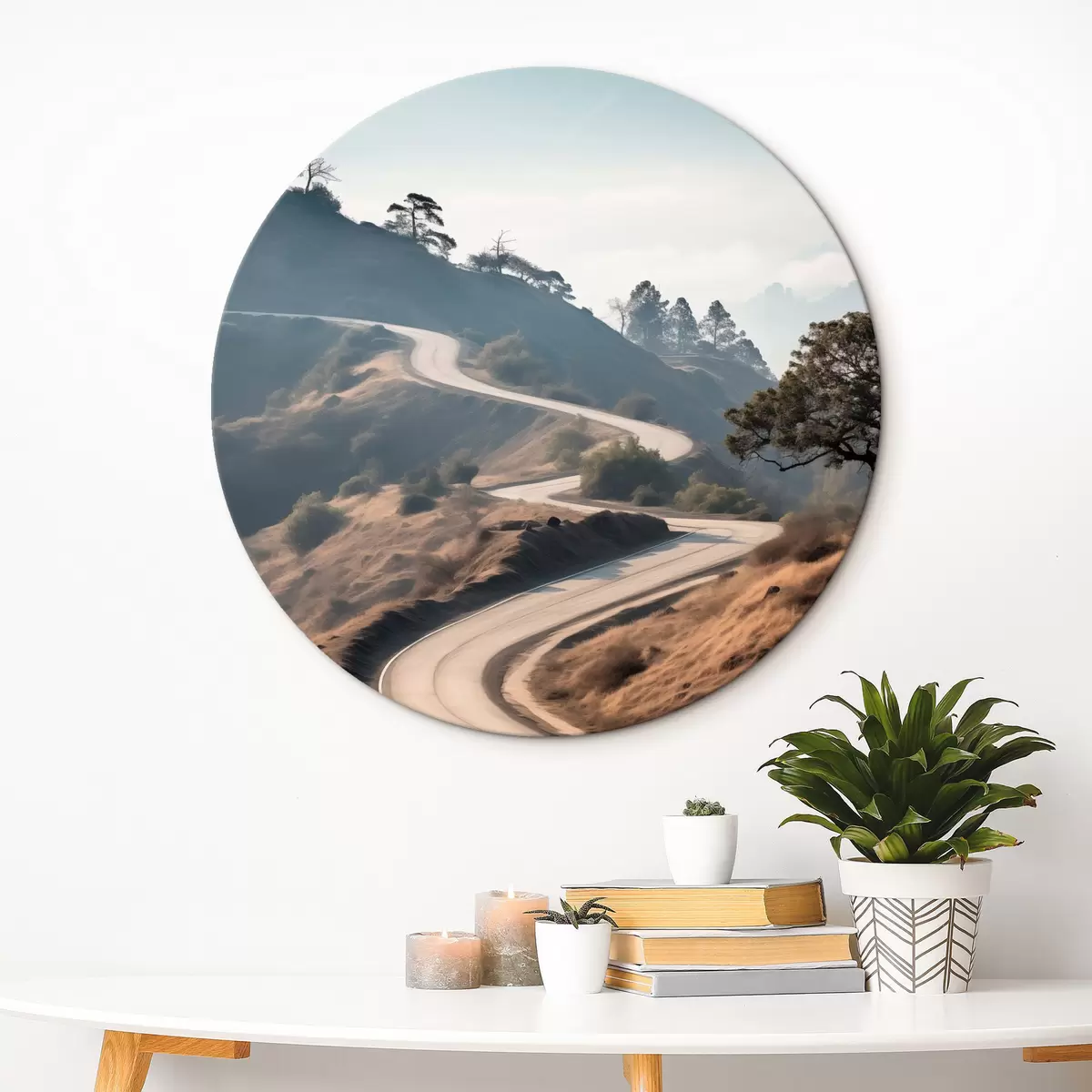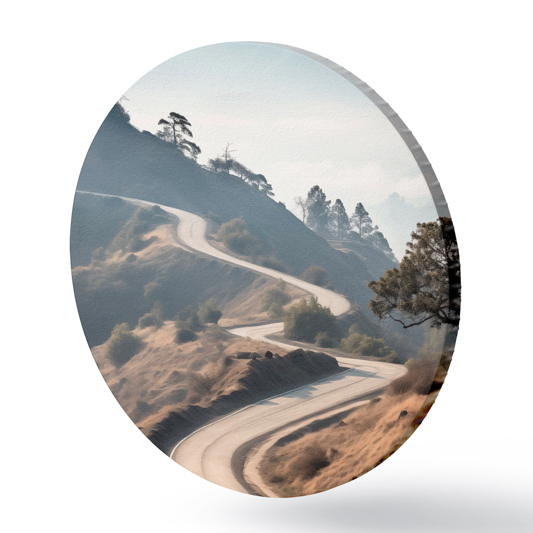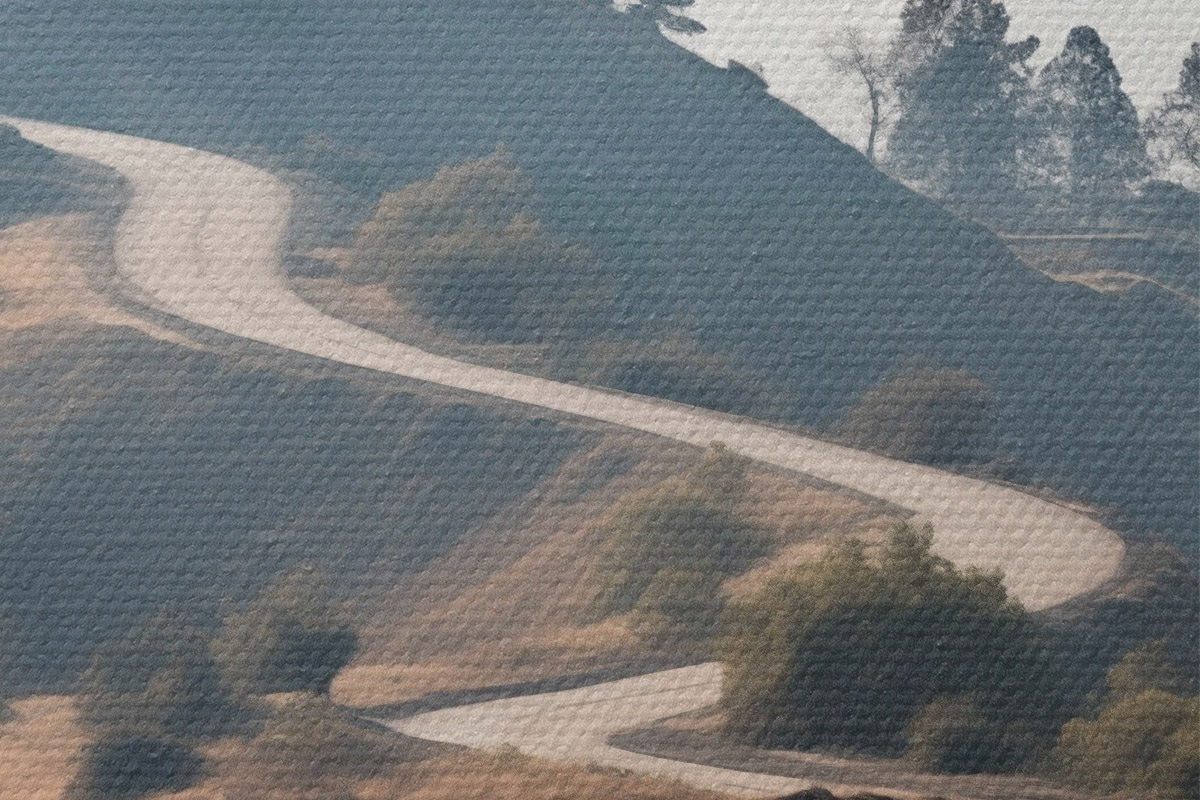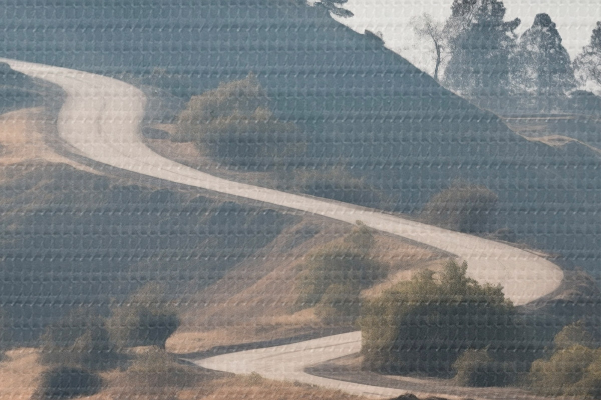 Obrázok Kľukatá cesta cez kopcovitú krajinu so suchou trávou pod jasnou oblohou s horami v diaľke Nr r46289