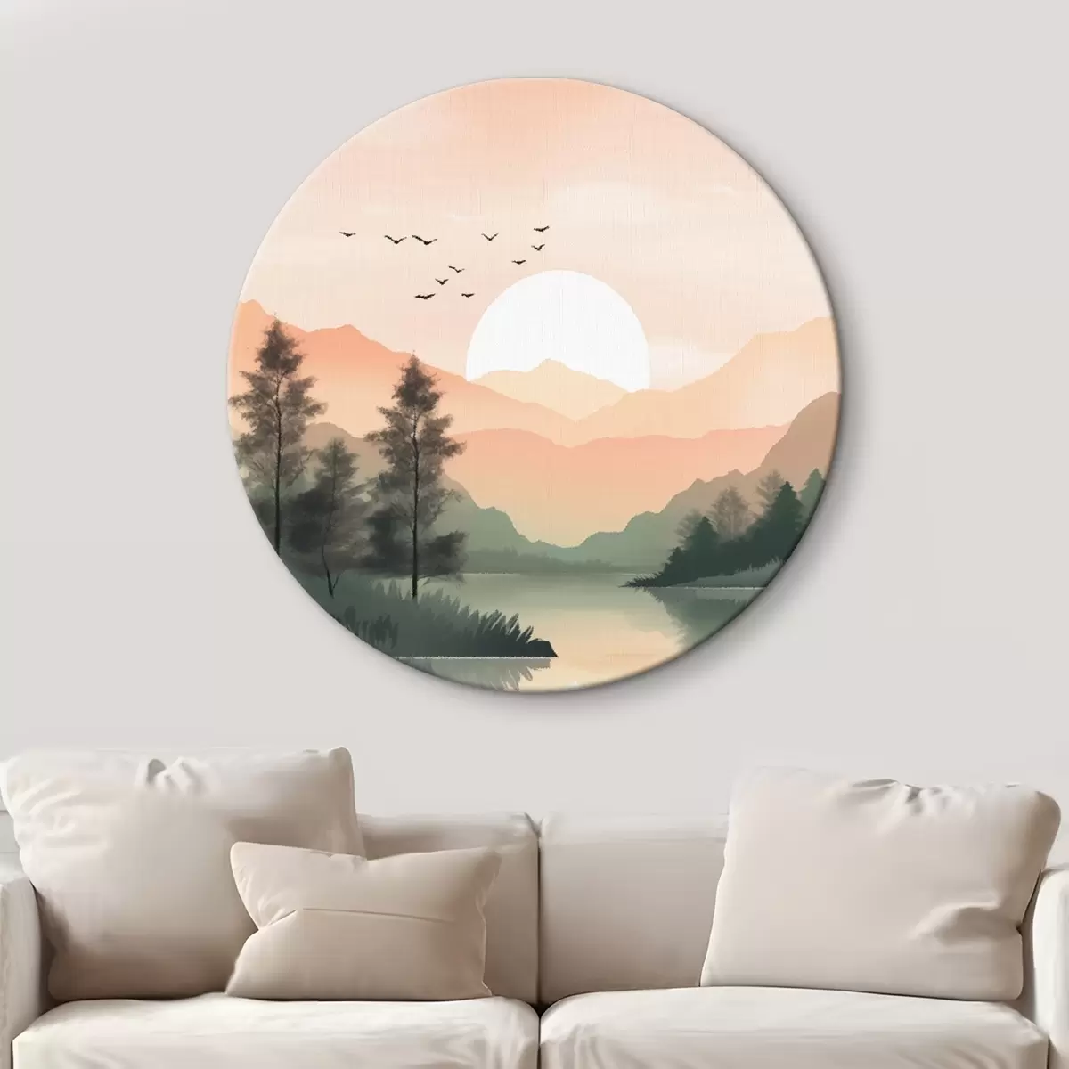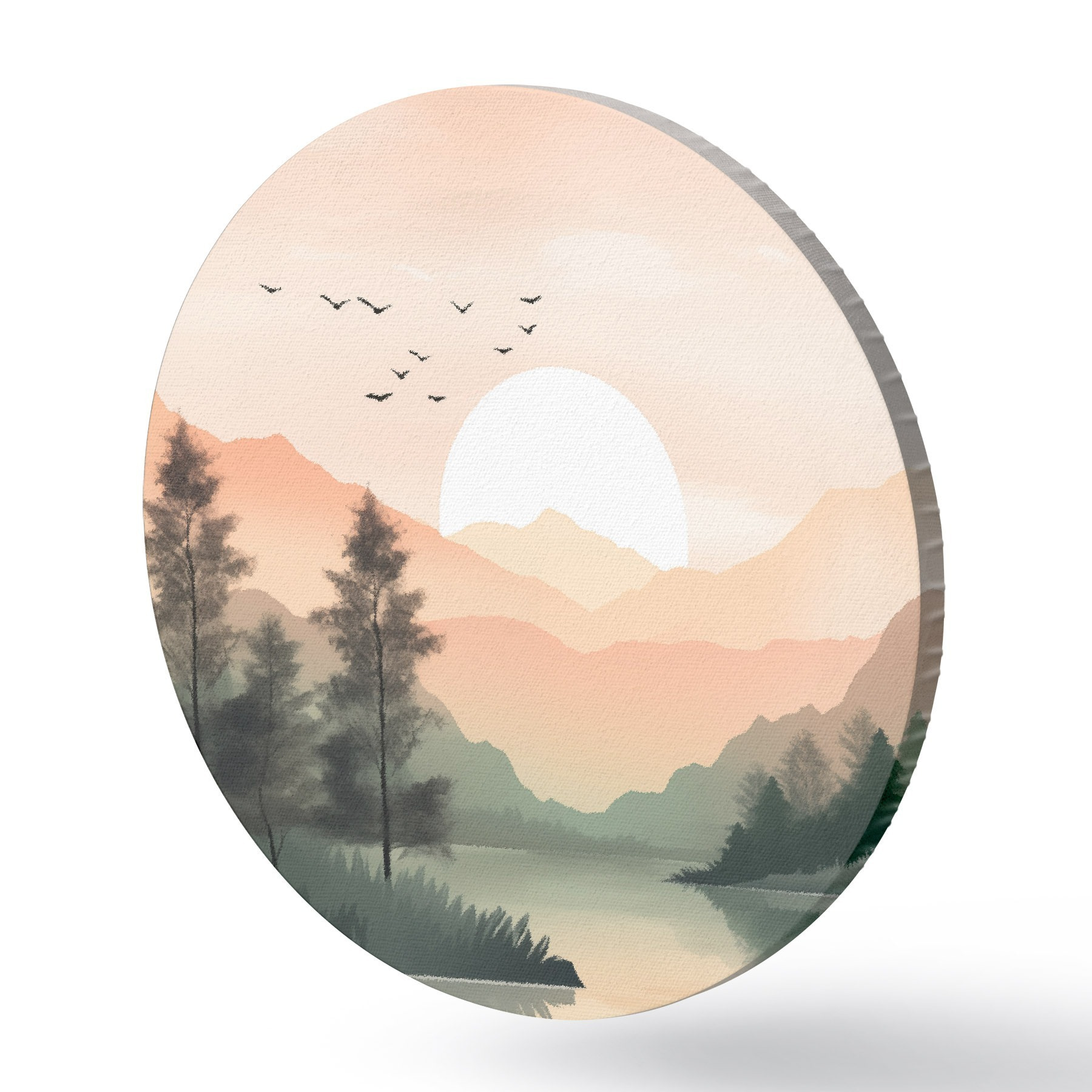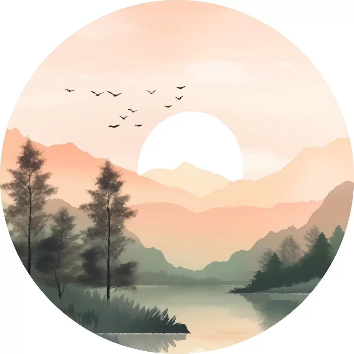 Obrázok Pastelový západ slnka nad pokojným jazerom s vzdialenými kopcami a vtákmi Nr r46508