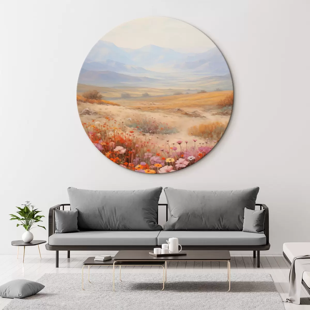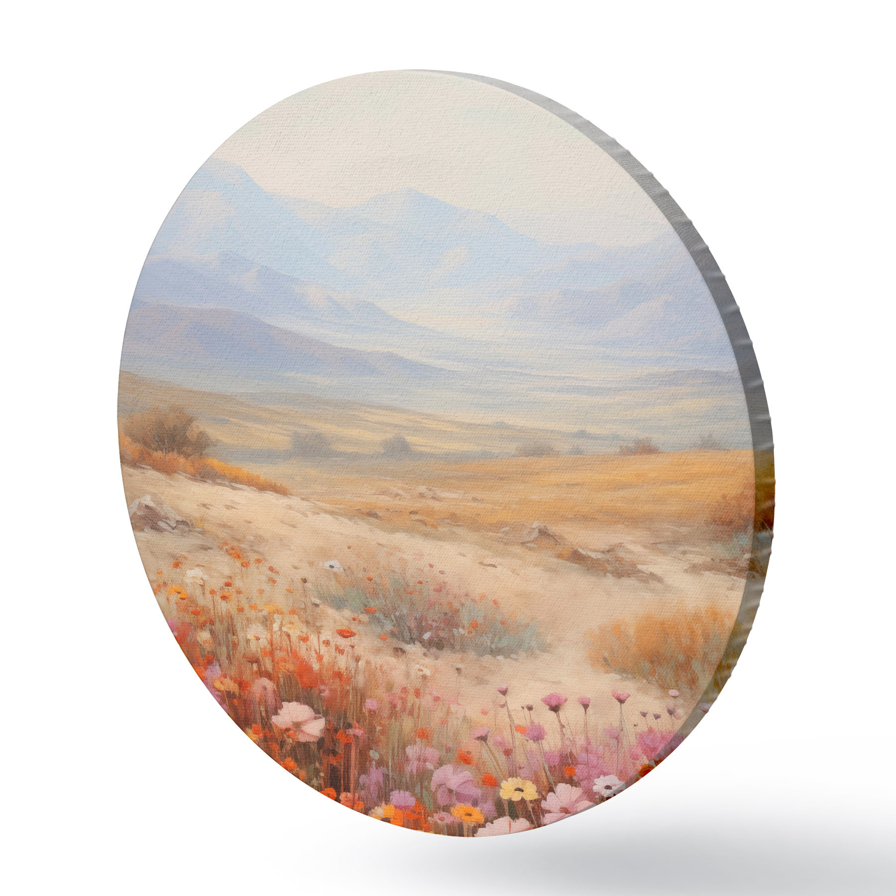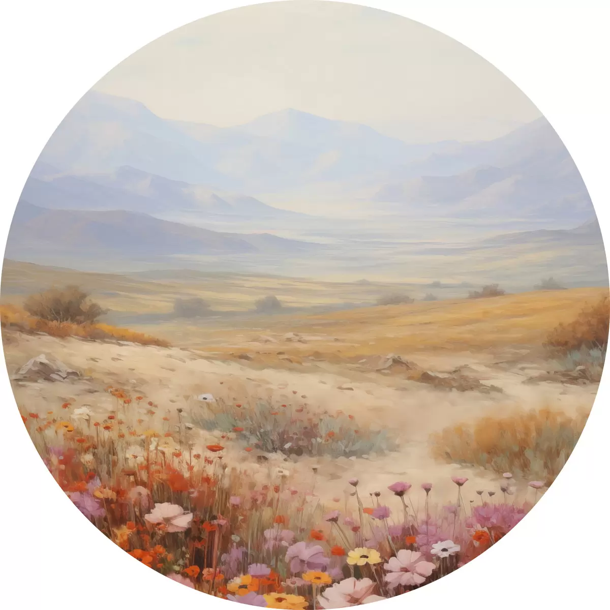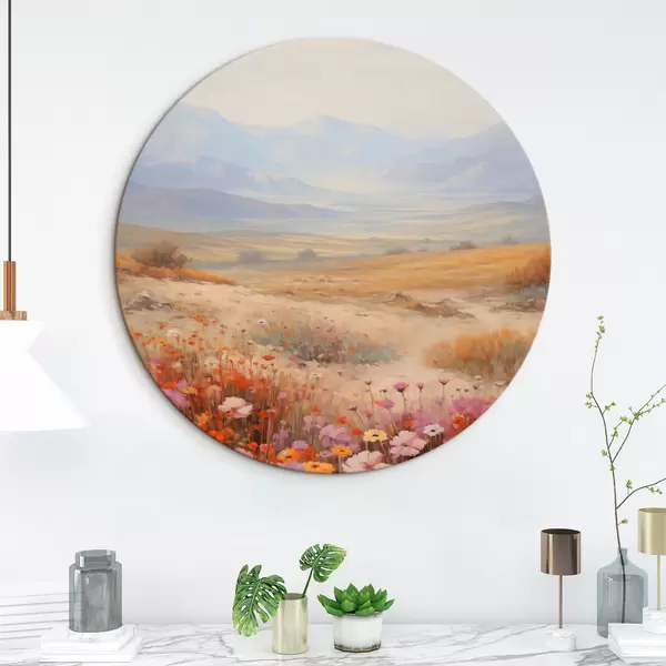 Obrázok Krajina, pole farebných kvetov s horami v pozadí, jemné pastelové farby Nr r46685