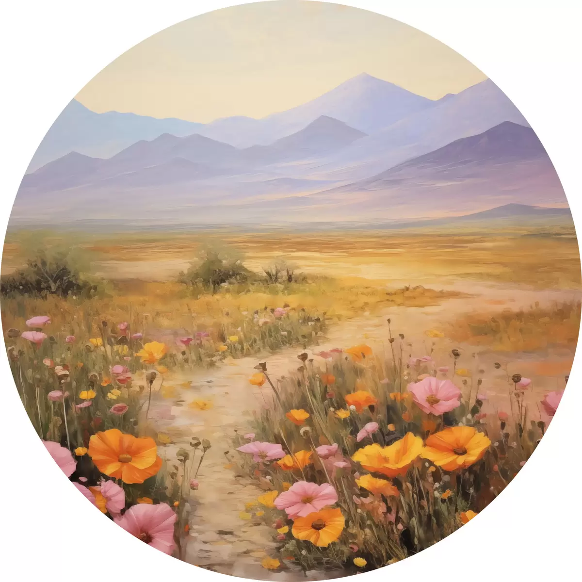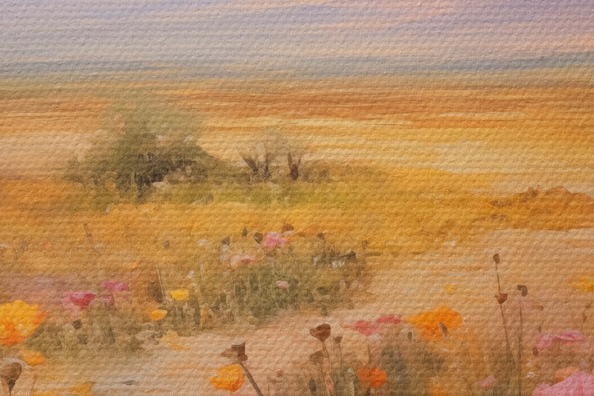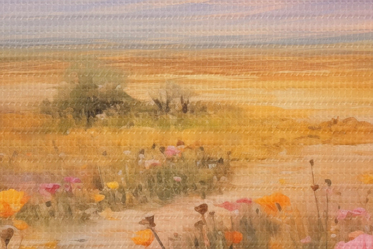 Obrázok Krajina, pole farebných kvetov s horami v pozadí, jemné pastelové farby Nr r46686