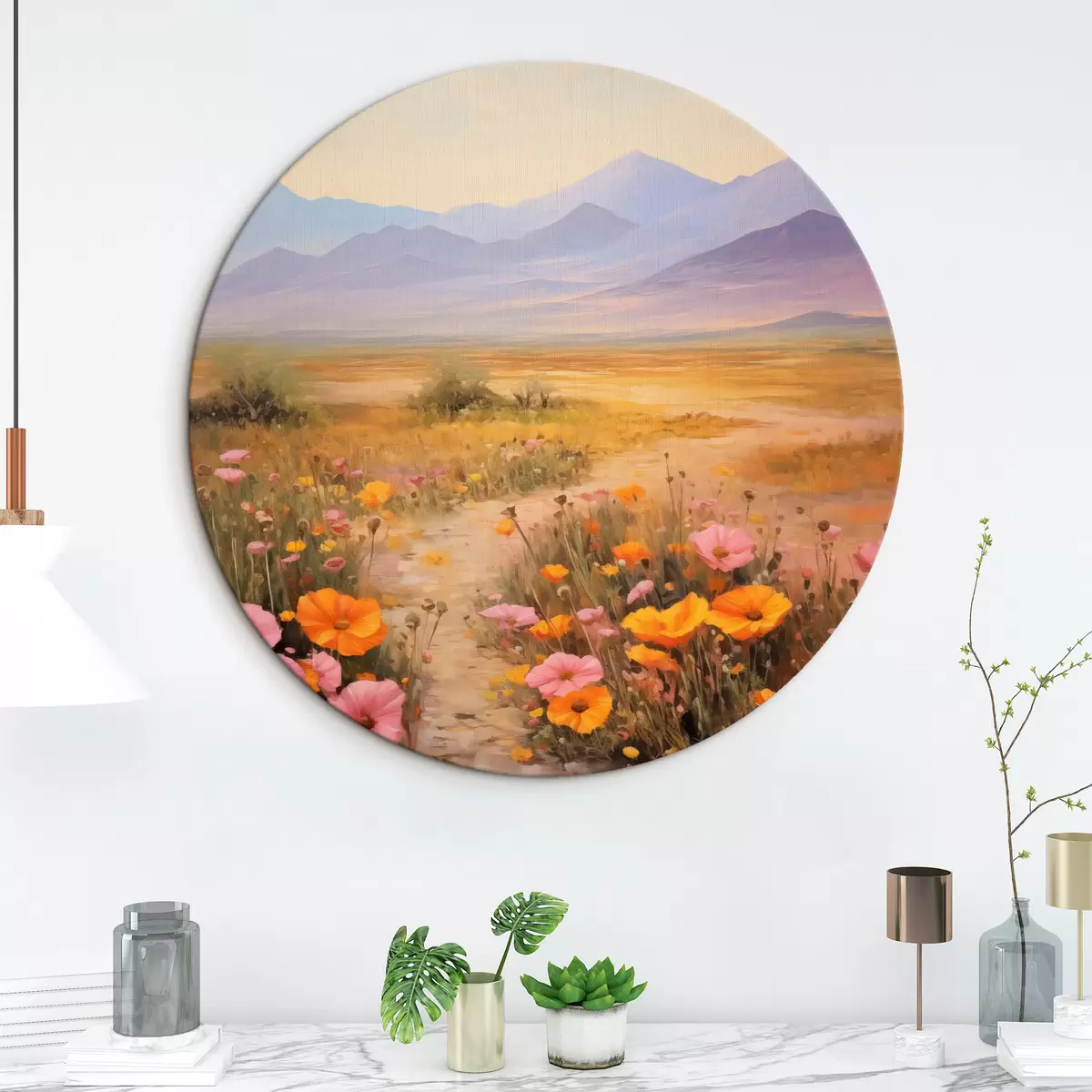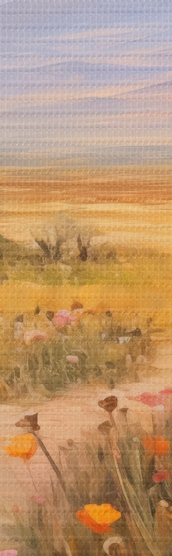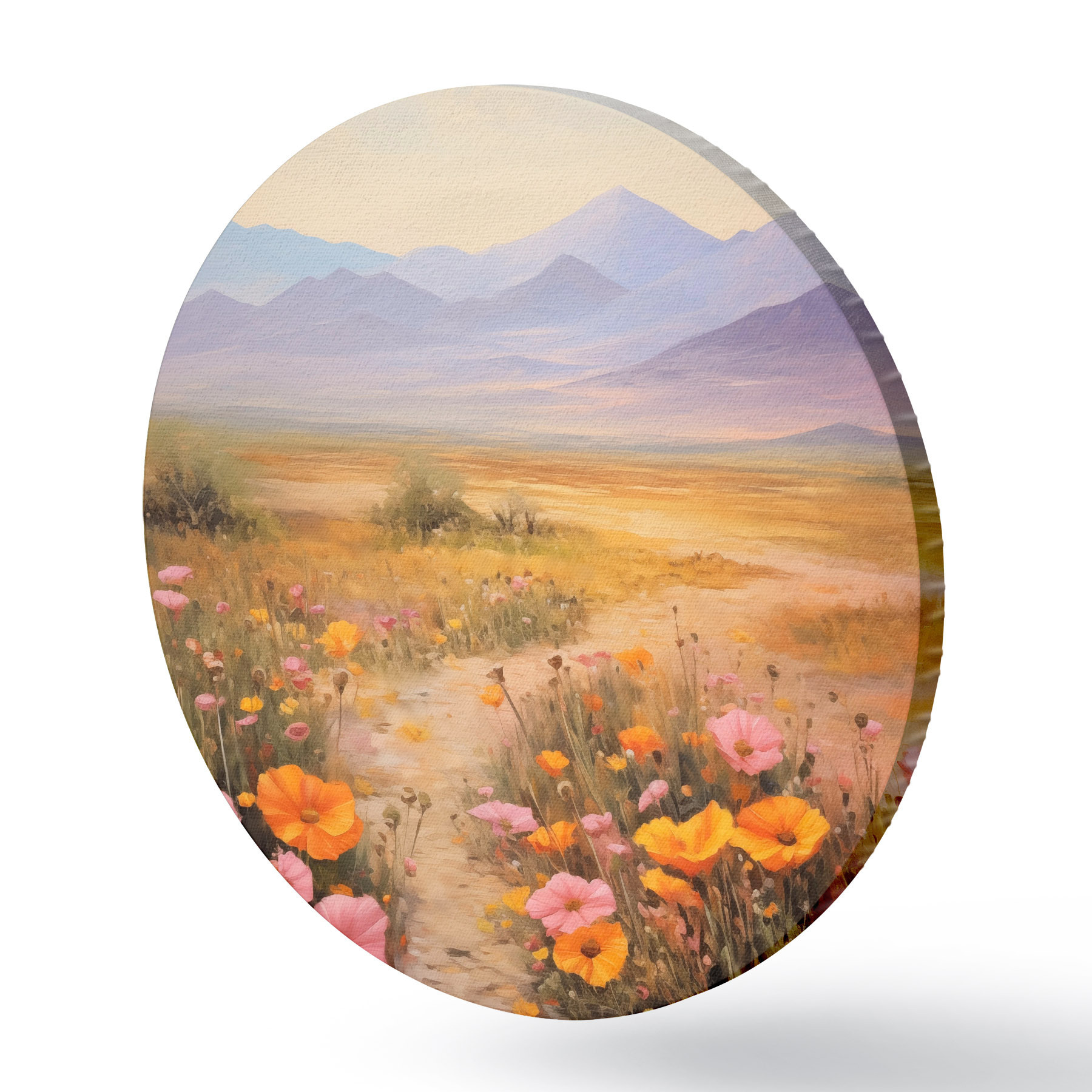 Obrázok Krajina, pole farebných kvetov s horami v pozadí, jemné pastelové farby Nr r46686
