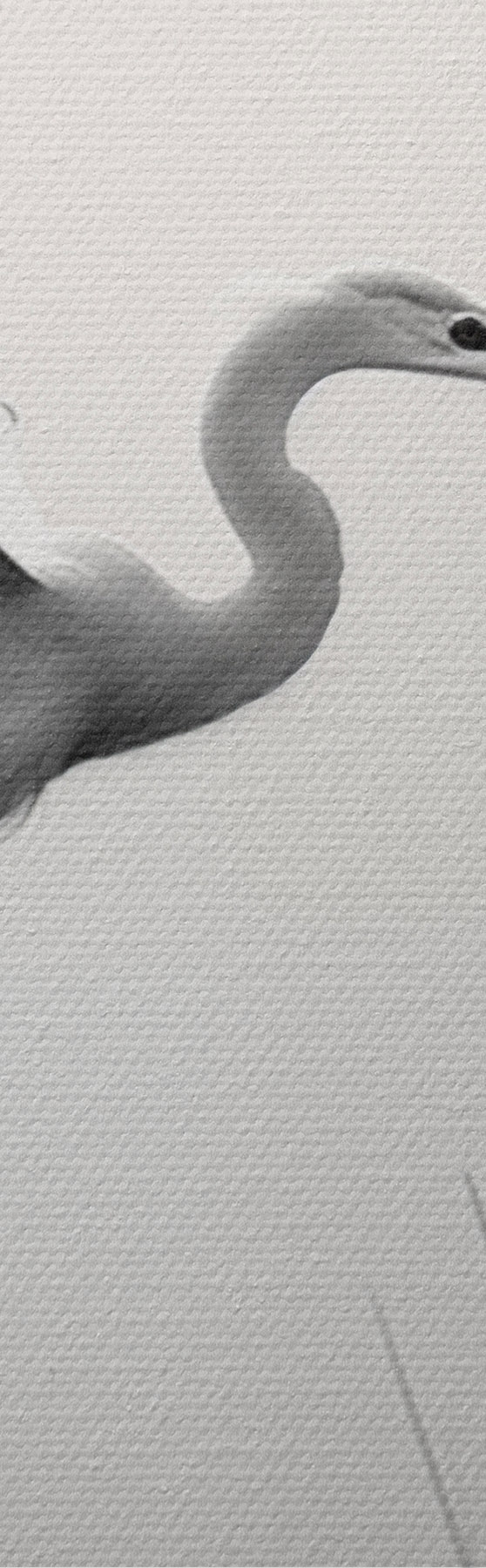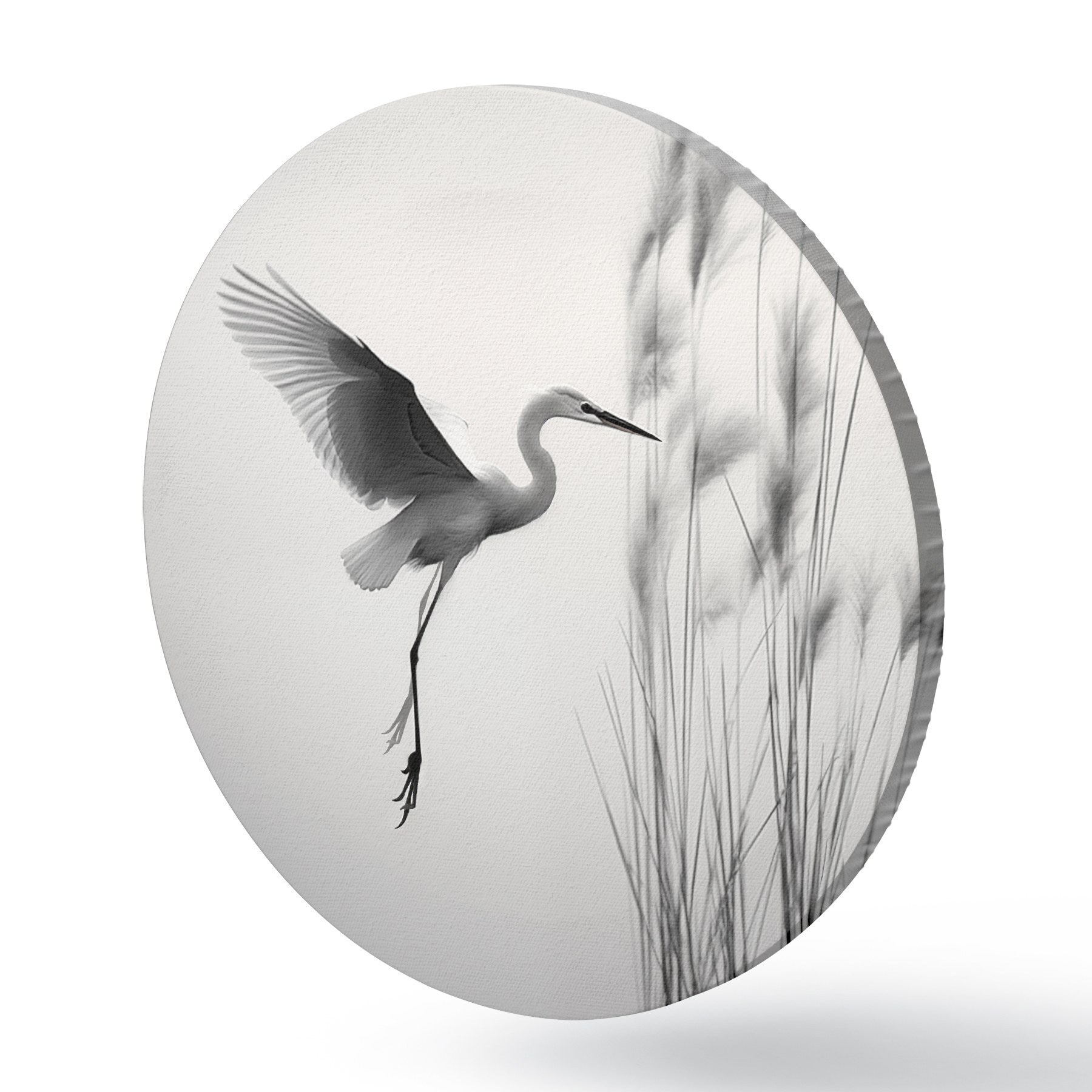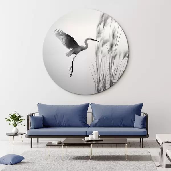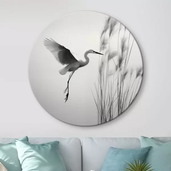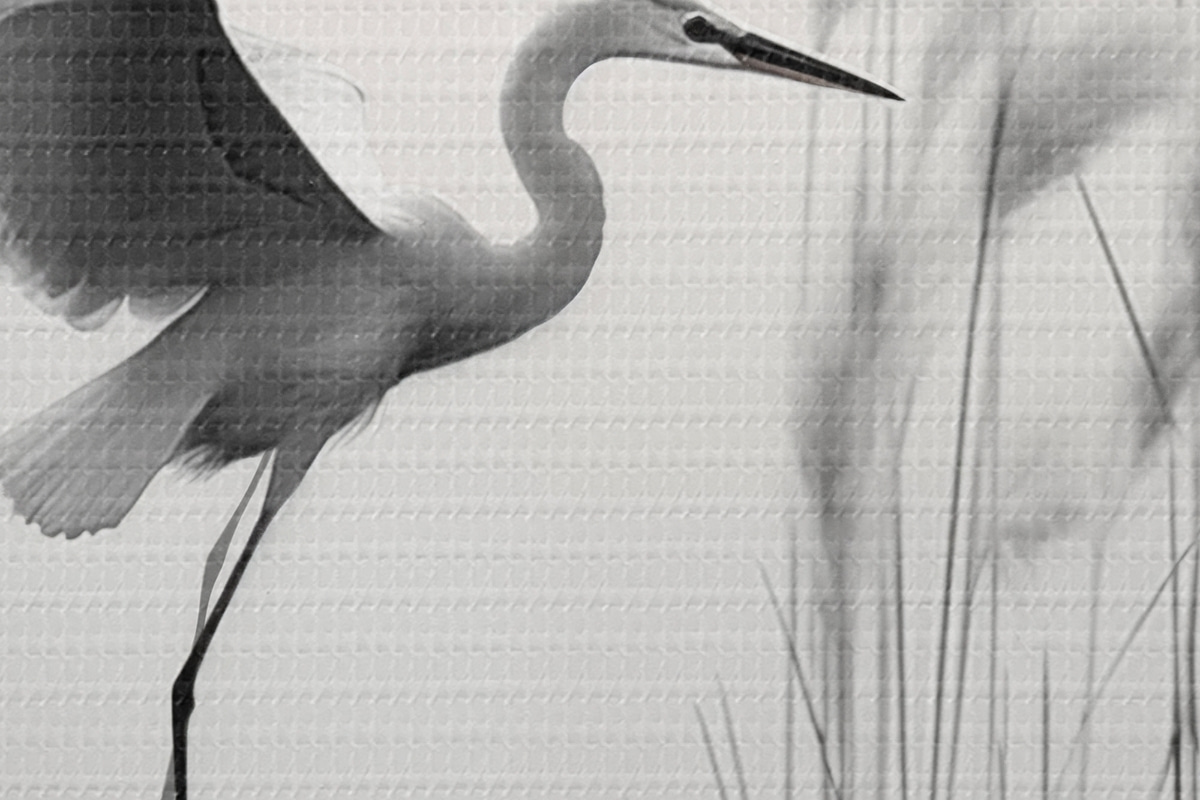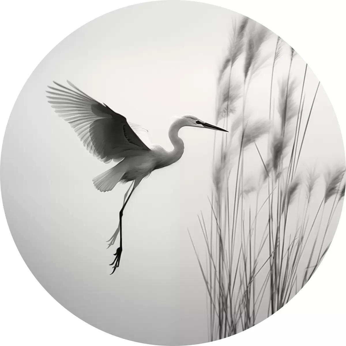 Obrázok Biela volavka s roztiahnutými krídlami, letiaca v blízkosti vysokých trstín, čierno-biela minimalistická kompozícia Nr r46693