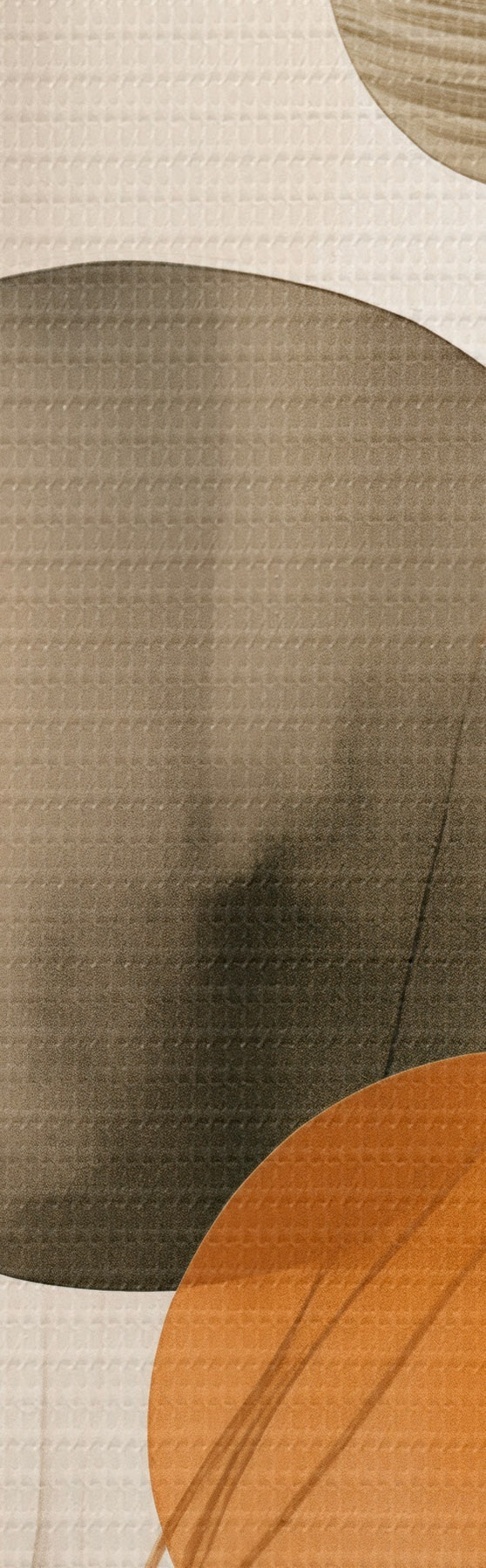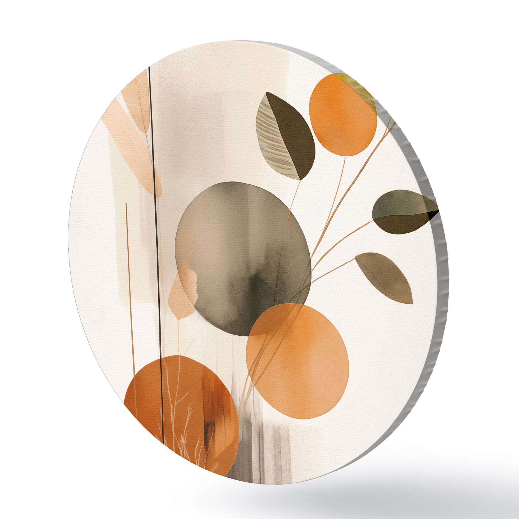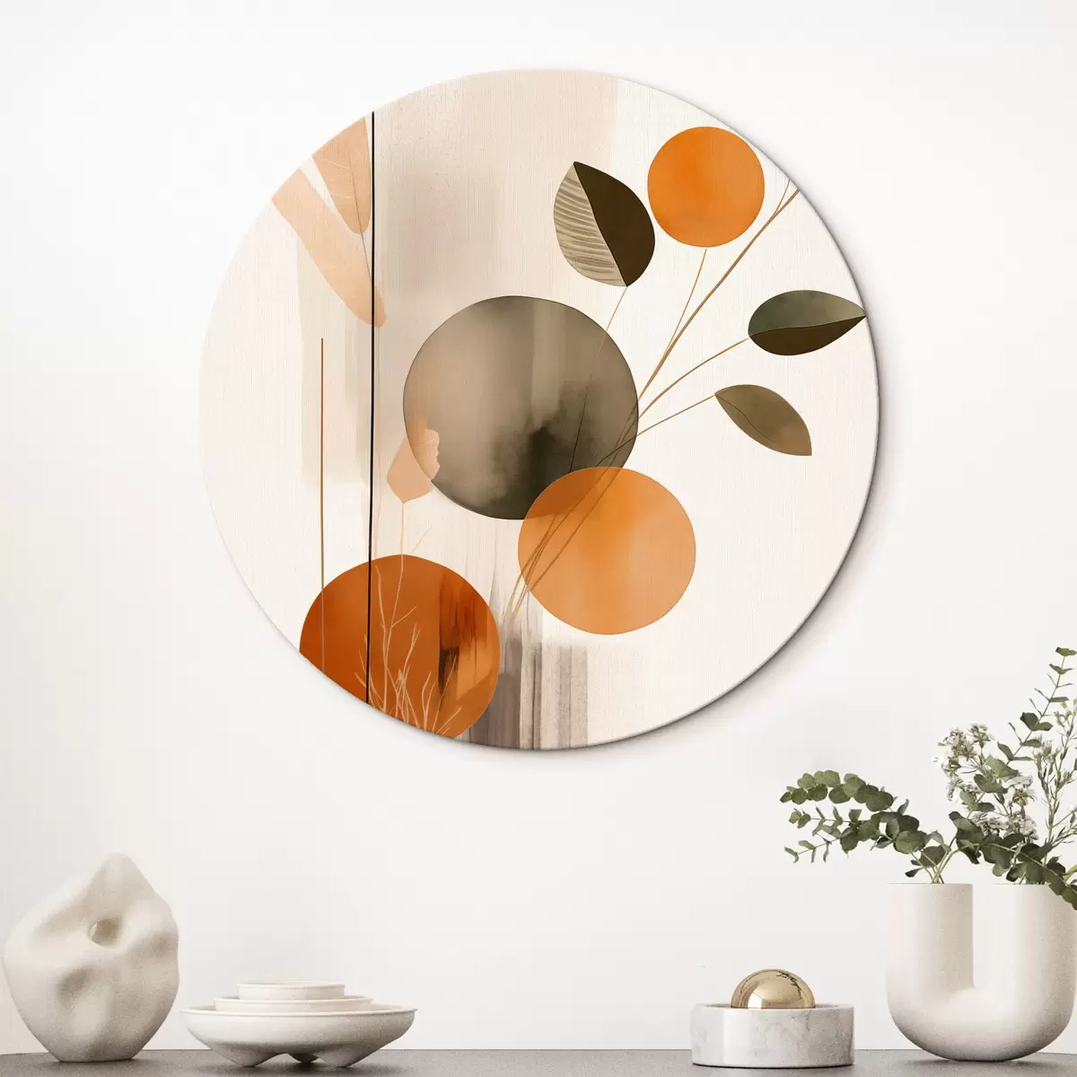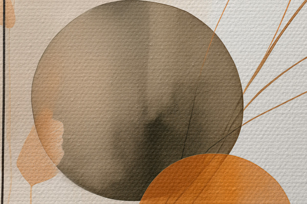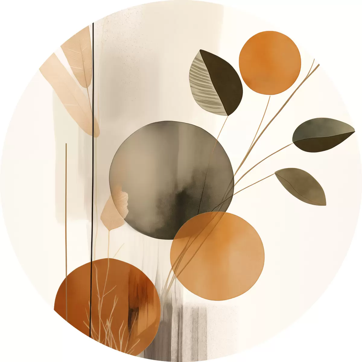 Obrázok Abstraktná maľba s oranžovými a sivými kruhmi, listami a vetvami, moderný štýl, akvarelový efekt Nr r46697