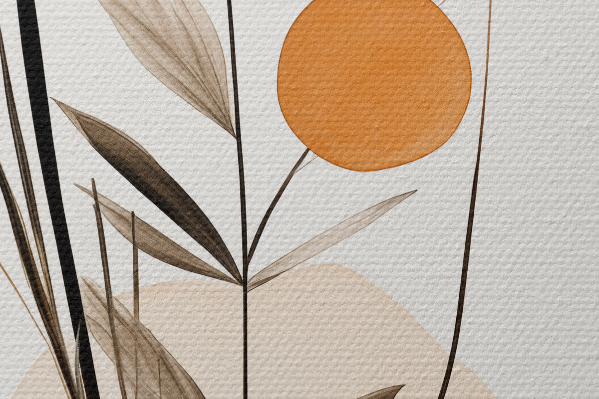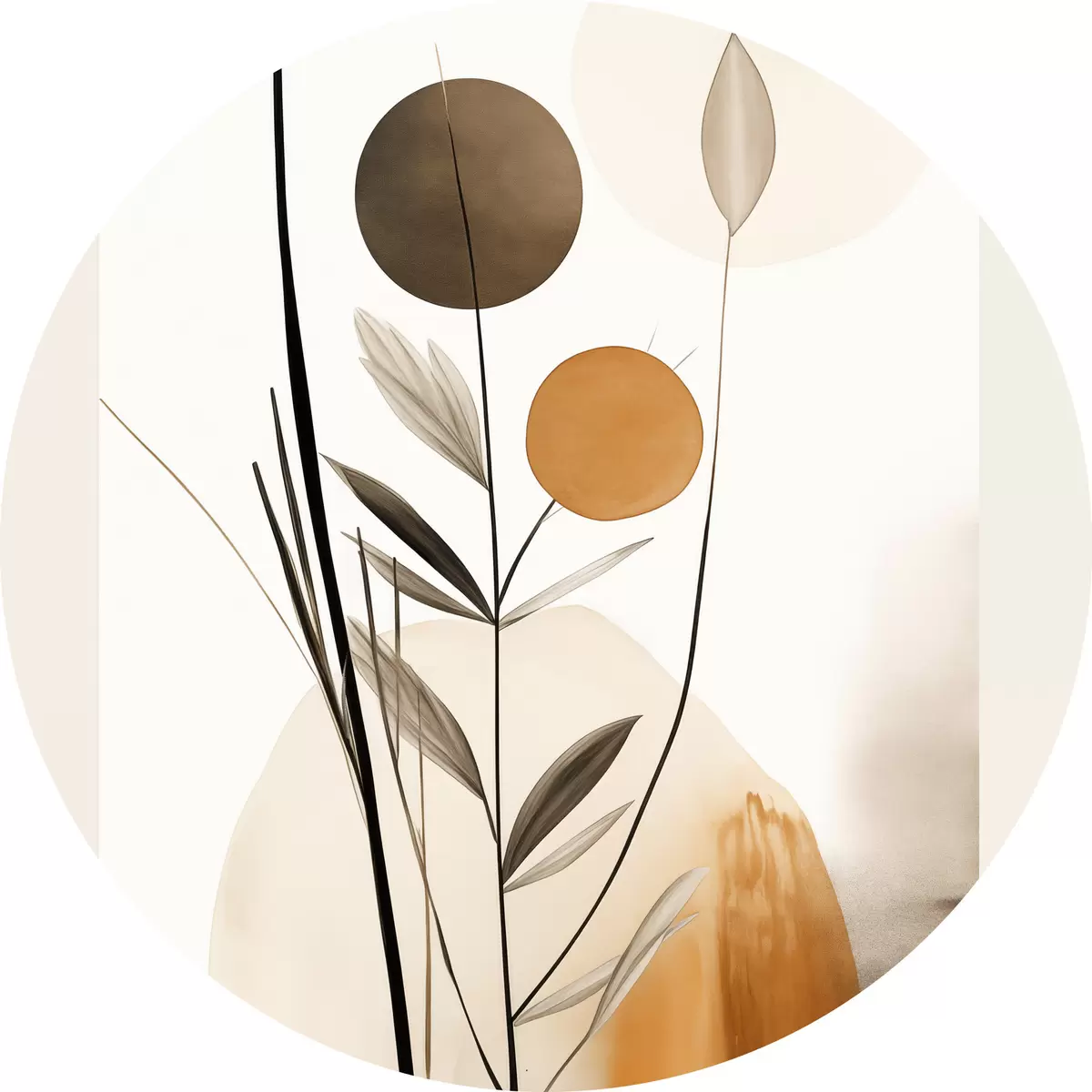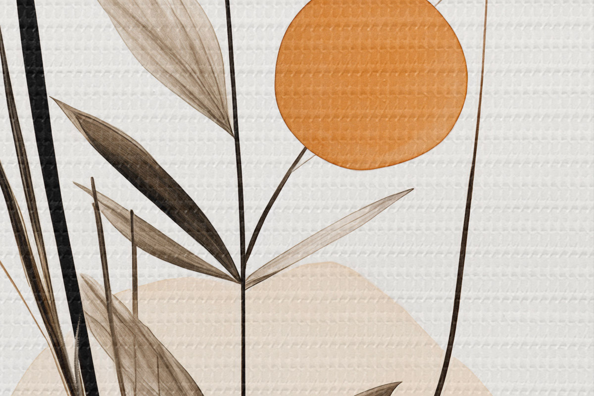 Obrázok Abstraktná maľba s oranžovými a sivými kruhmi, listami a vetvami, moderný štýl, akvarelový efekt Nr r46698