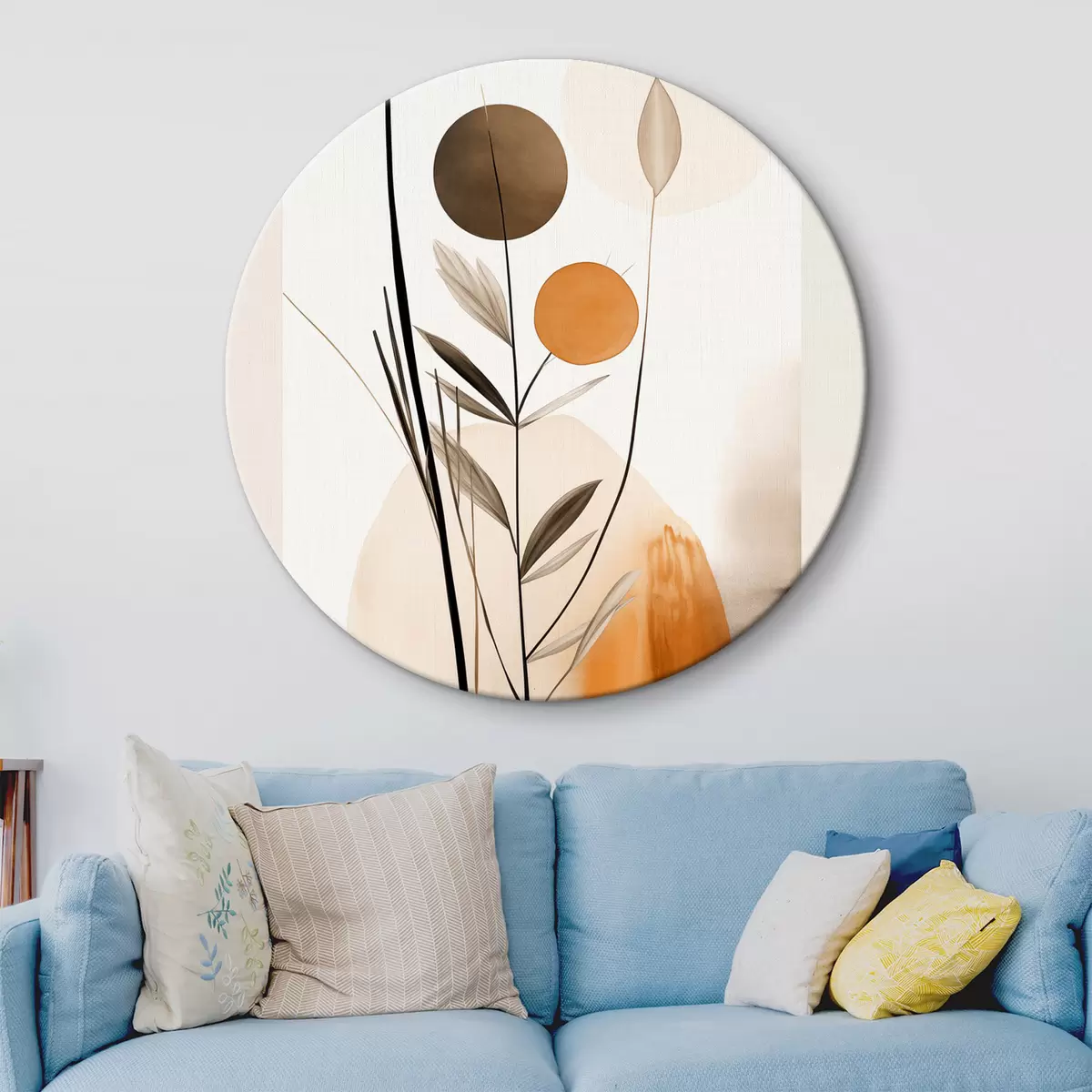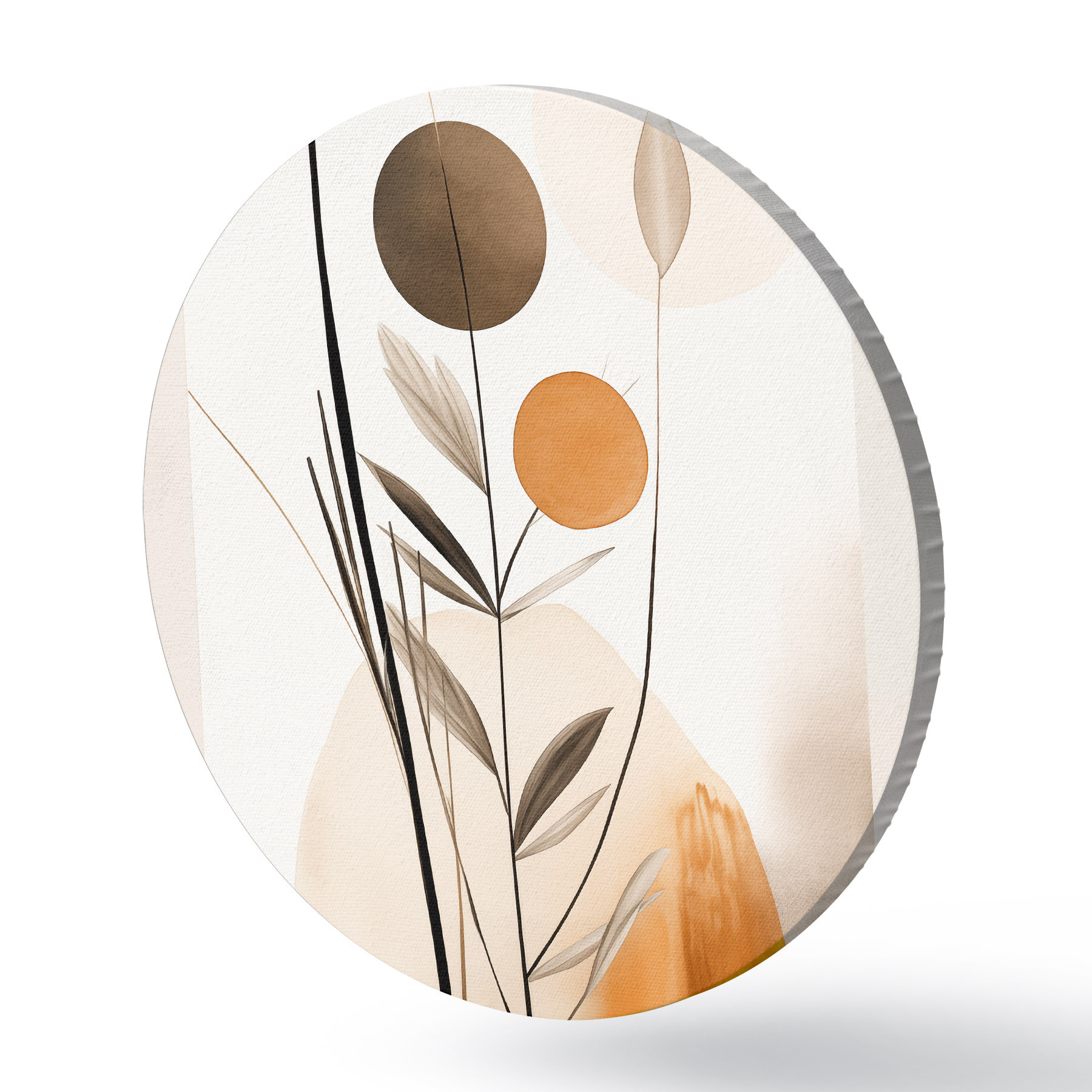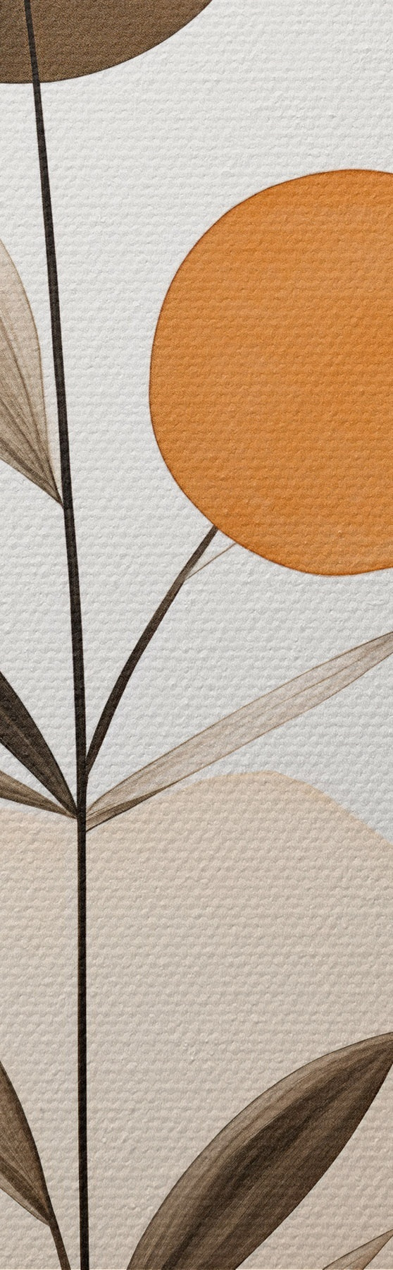 Obrázok Abstraktná maľba s oranžovými a sivými kruhmi, listami a vetvami, moderný štýl, akvarelový efekt Nr r46698
