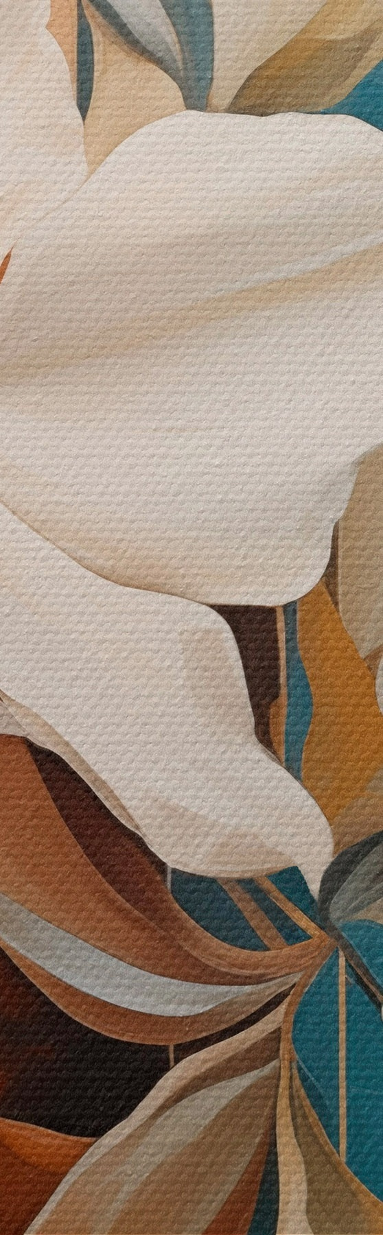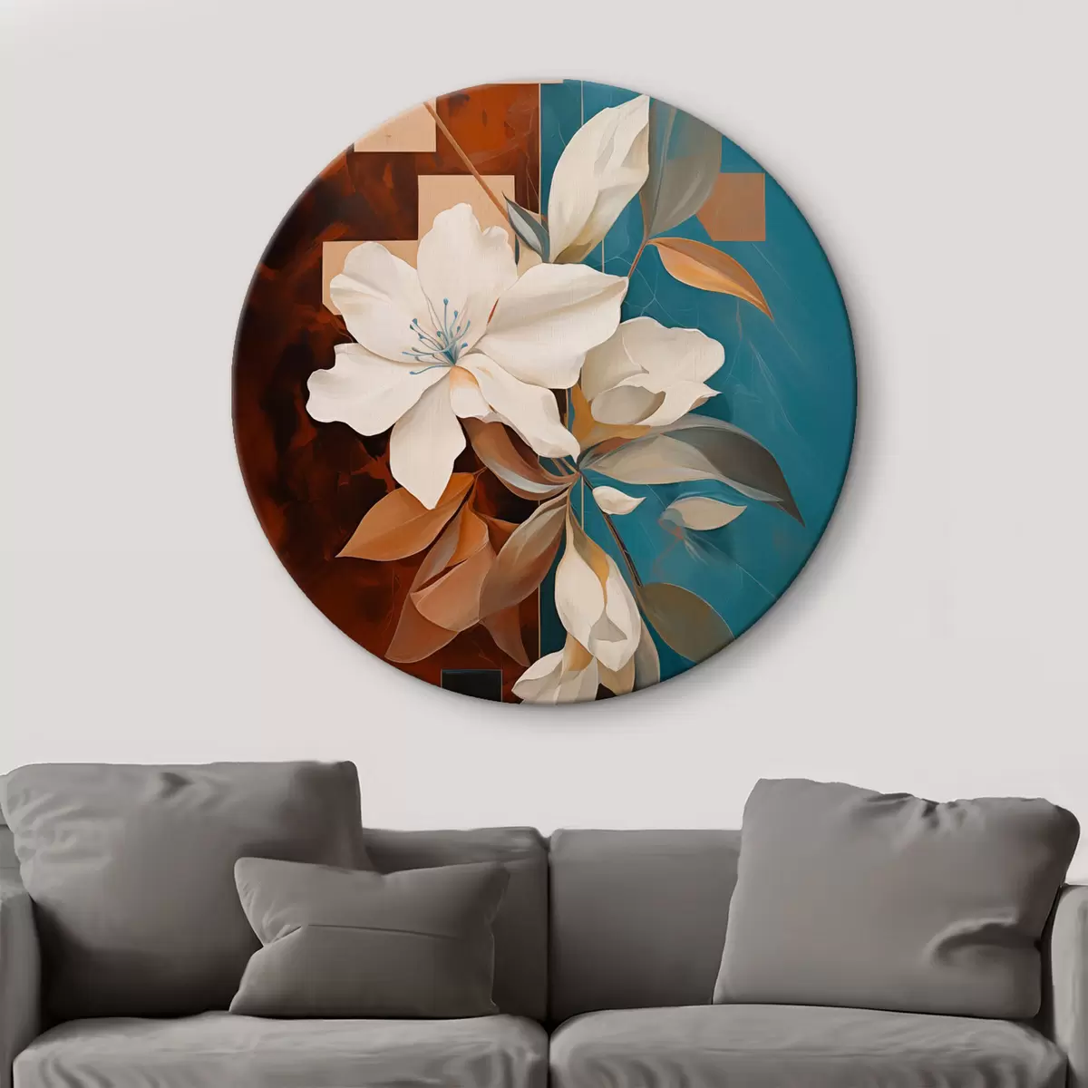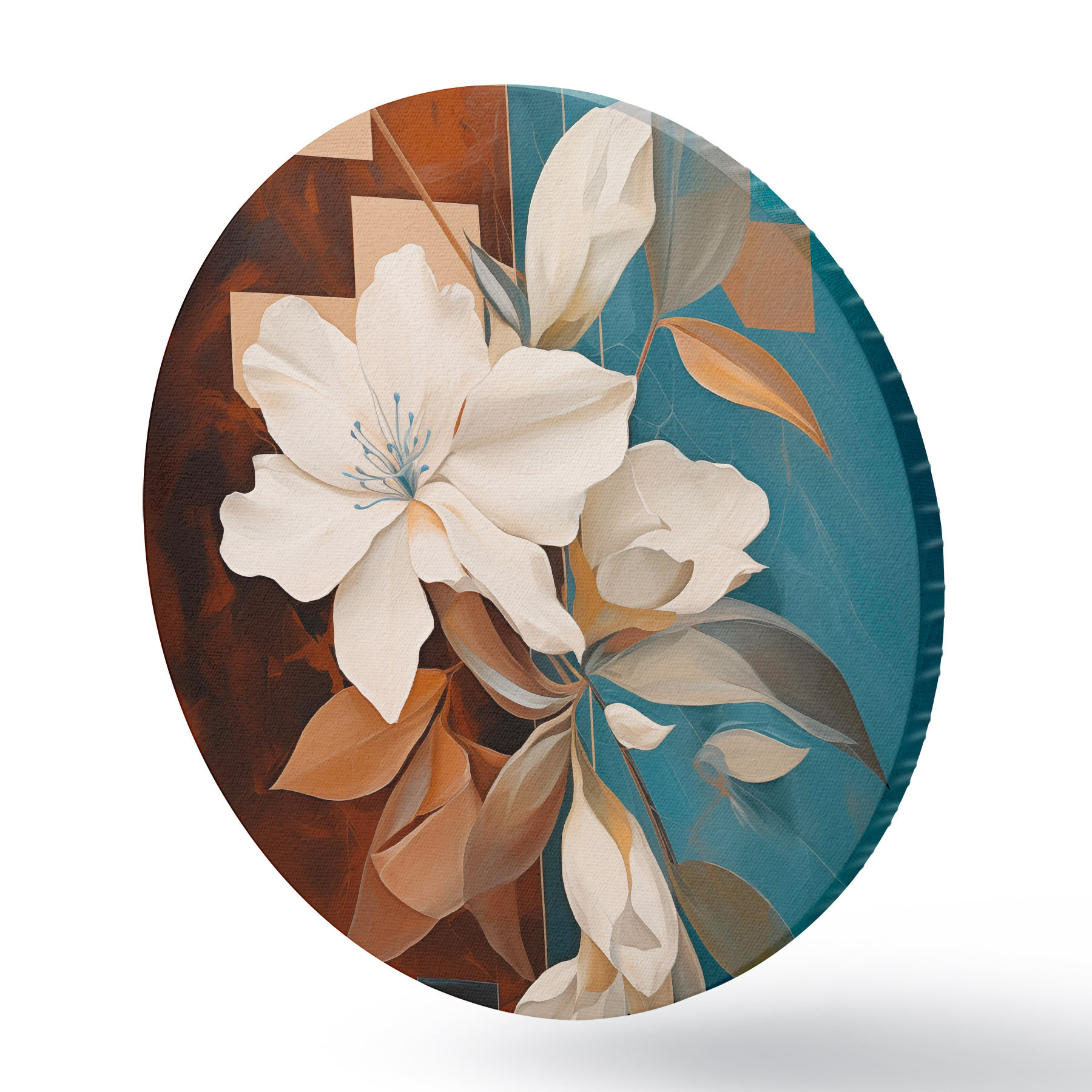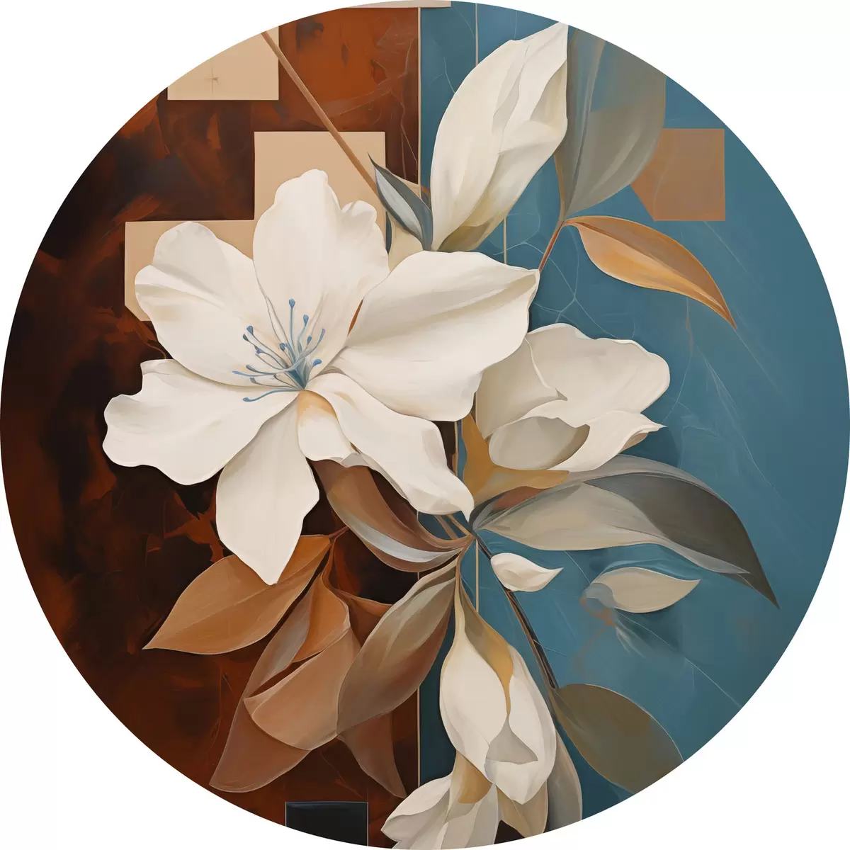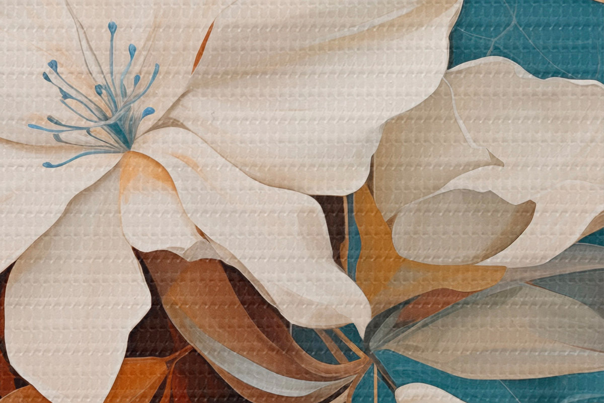 Obrázok Abstraktné biele kvety a listy na pozadí hnedých a modrých abstraktných tvarov v minimalistickom štýle Nr r46709