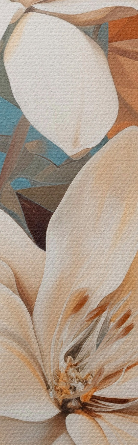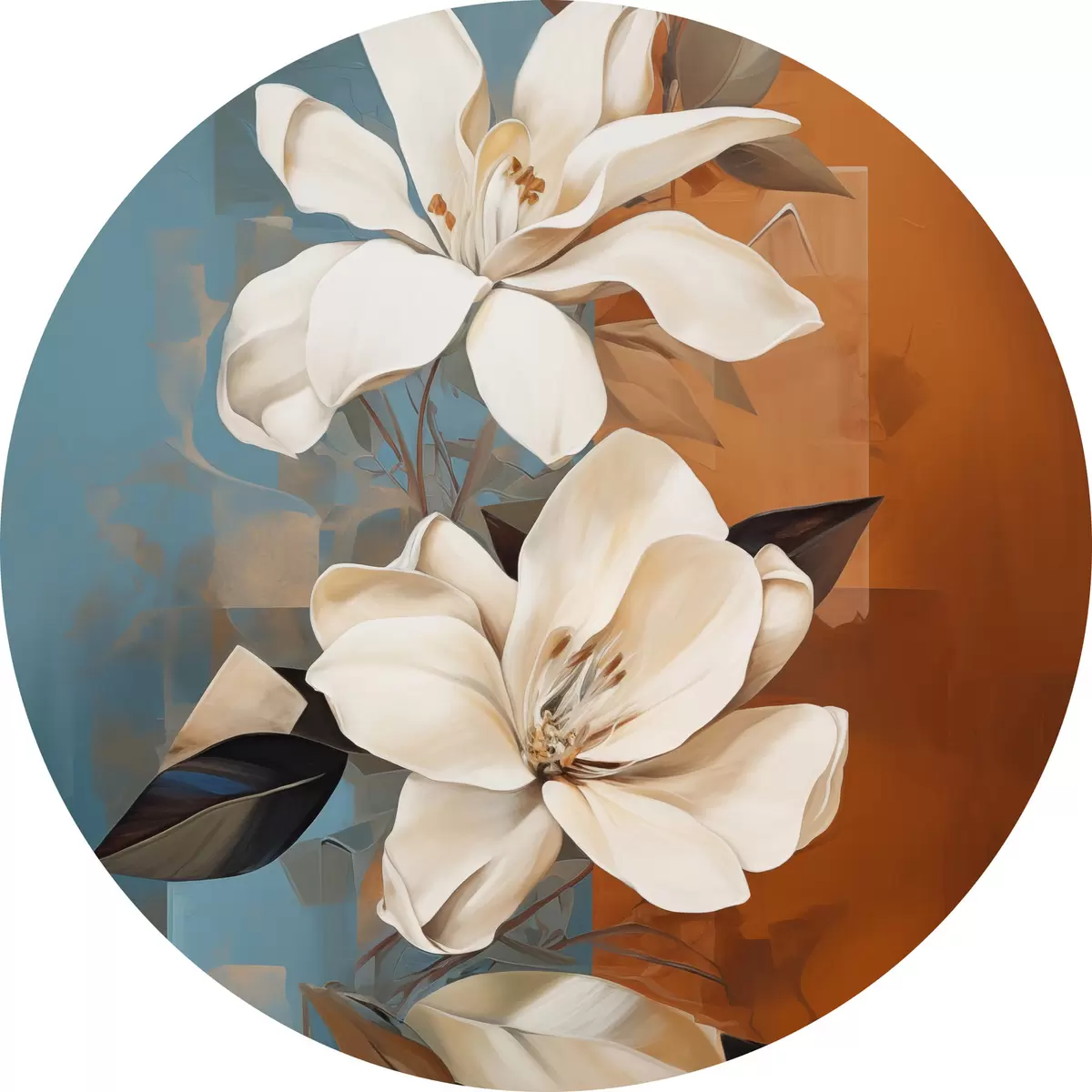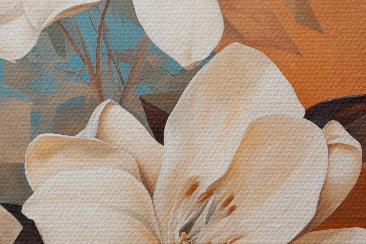 Obrázok Abstraktné biele kvety a listy na pozadí hnedých a modrých abstraktných tvarov v minimalistickom štýle Nr r46710