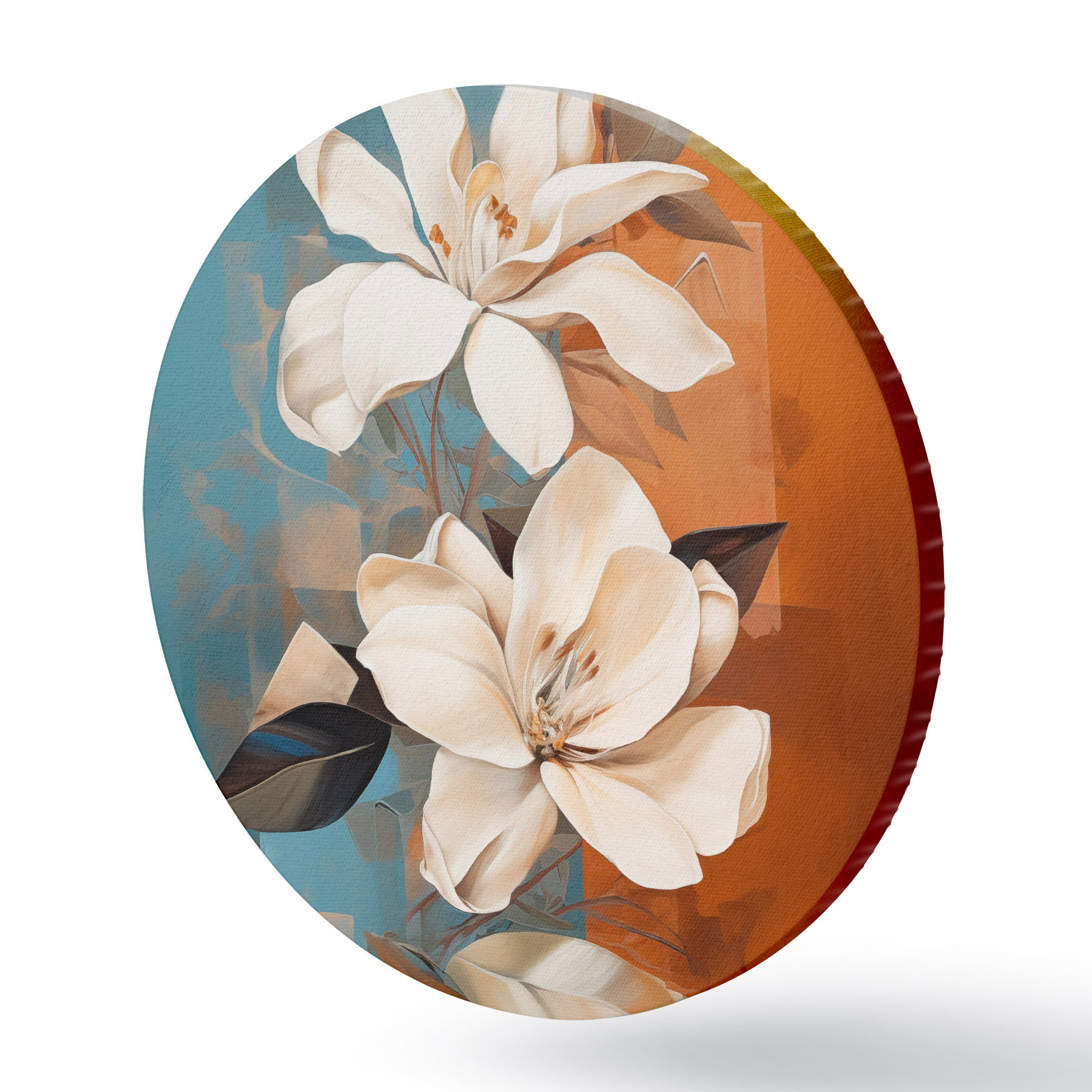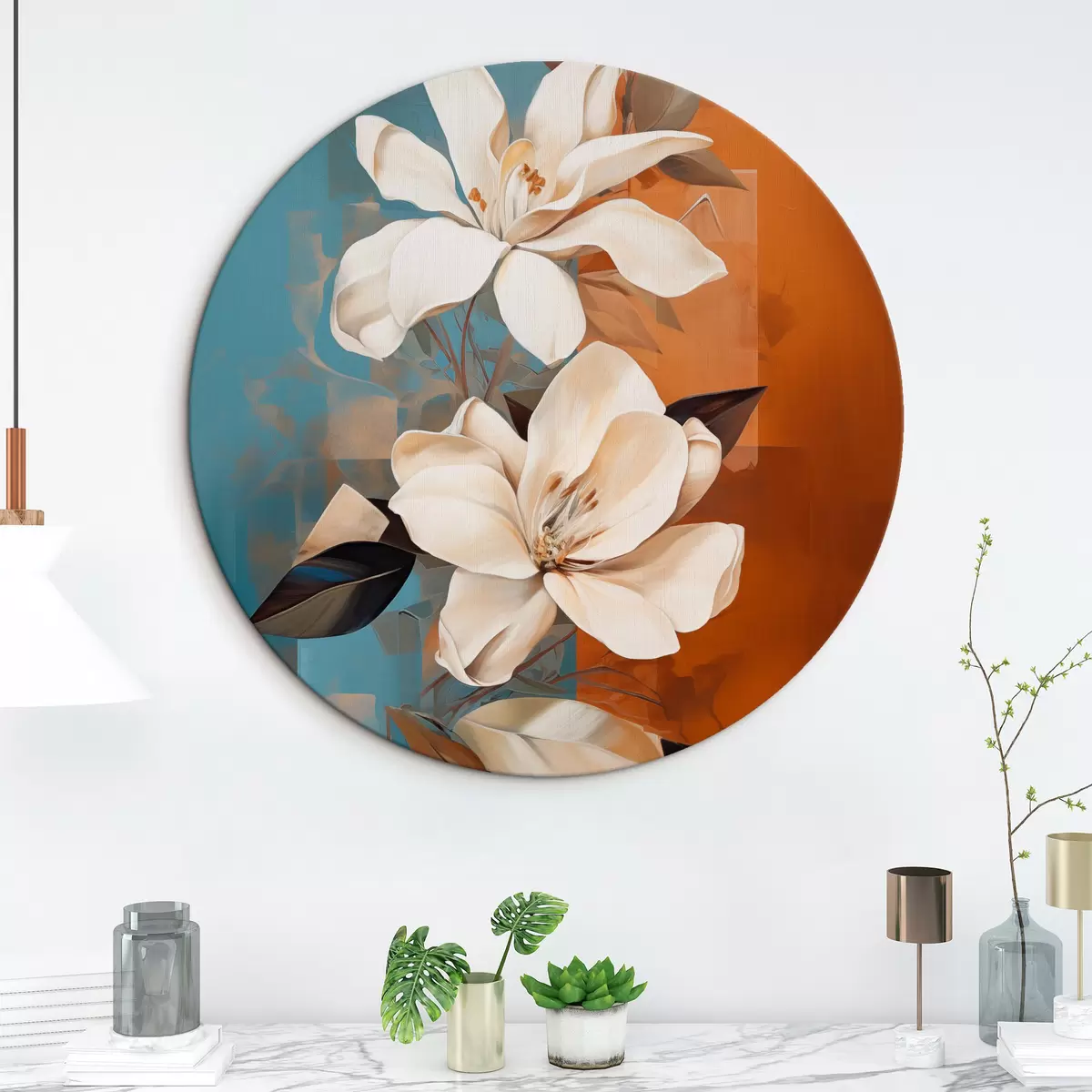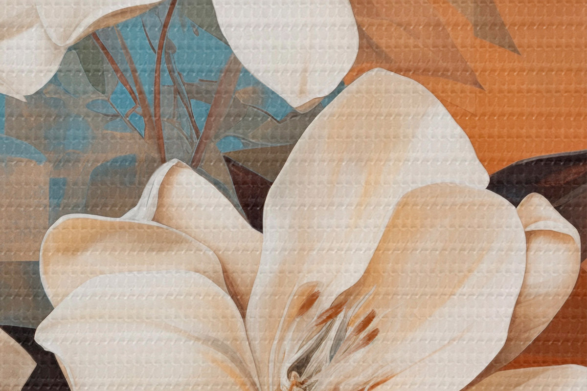 Obrázok Abstraktné biele kvety a listy na pozadí hnedých a modrých abstraktných tvarov v minimalistickom štýle Nr r46710