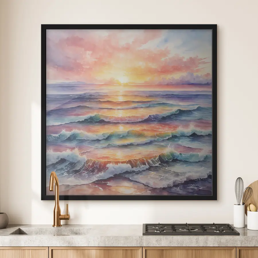 Pohľad na západ slnka z pláže v akvarelovej farbe