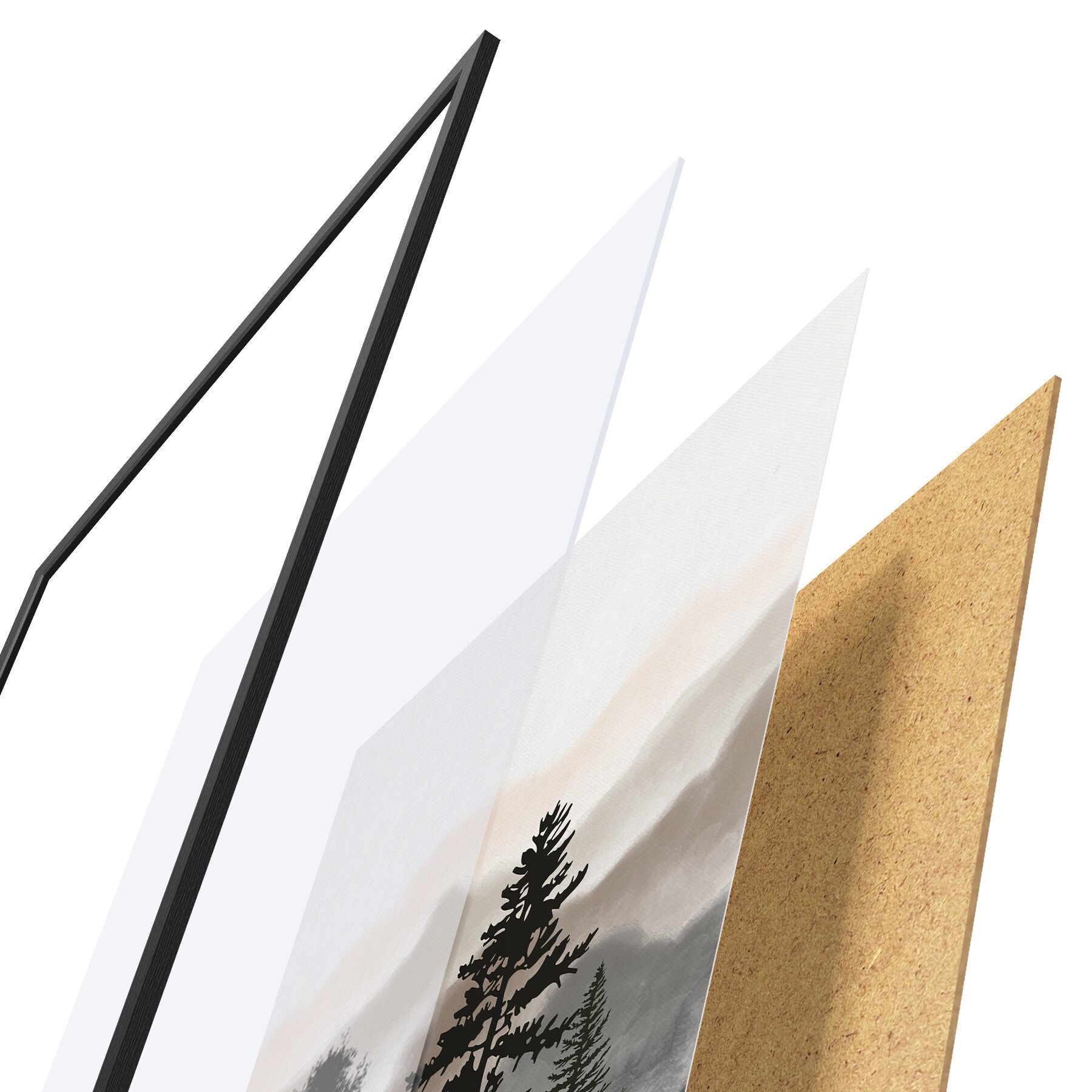 Plagát sa skladá z rámu, plexiskla, vytlačeného obrazu a podkladu z drevotriesky. Plagát možno okamžite zavesiť na stenu vďaka úchytom na zadnej strane.