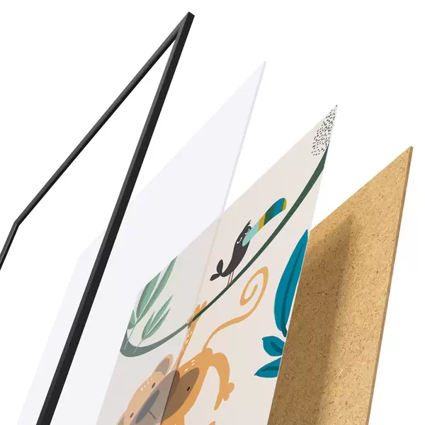 Plagát sa skladá z rámu, plexiskla, vytlačeného obrazu a podkladu z drevotriesky. Plagát možno okamžite zavesiť na stenu vďaka úchytom na zadnej strane.