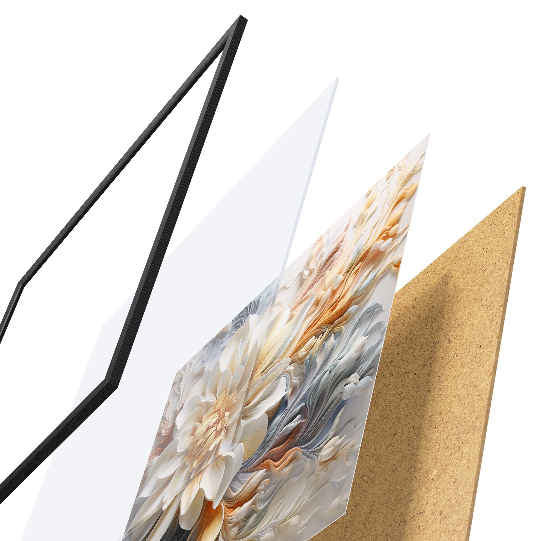 Plagát sa skladá z rámu, plexiskla, vytlačeného obrazu a podkladu z drevotriesky. Plagát možno okamžite zavesiť na stenu vďaka úchytom na zadnej strane.