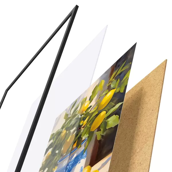 Plagát sa skladá z rámu, plexiskla, vytlačeného obrazu a podkladu z drevotriesky. Plagát možno okamžite zavesiť na stenu vďaka úchytom na zadnej strane.