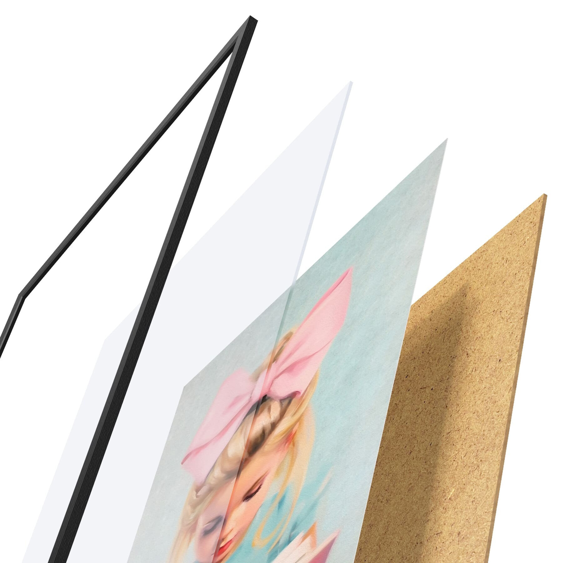 Plagát sa skladá z rámu, plexiskla, vytlačeného obrazu a podkladu z drevotriesky. Plagát možno okamžite zavesiť na stenu vďaka úchytom na zadnej strane.