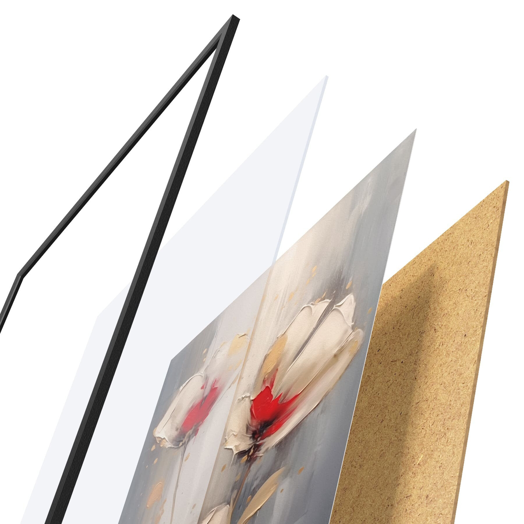 Plagát sa skladá z rámu, plexiskla, vytlačeného obrazu a podkladu z drevotriesky. Plagát možno okamžite zavesiť na stenu vďaka úchytom na zadnej strane.