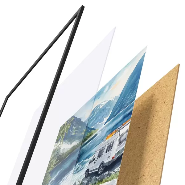 Plagát sa skladá z rámu, plexiskla, vytlačeného obrazu a podkladu z drevotriesky. Plagát možno okamžite zavesiť na stenu vďaka úchytom na zadnej strane.