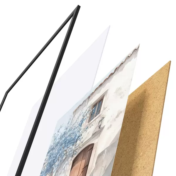 Plagát sa skladá z rámu, plexiskla, vytlačeného obrazu a podkladu z drevotriesky. Plagát možno okamžite zavesiť na stenu vďaka úchytom na zadnej strane.