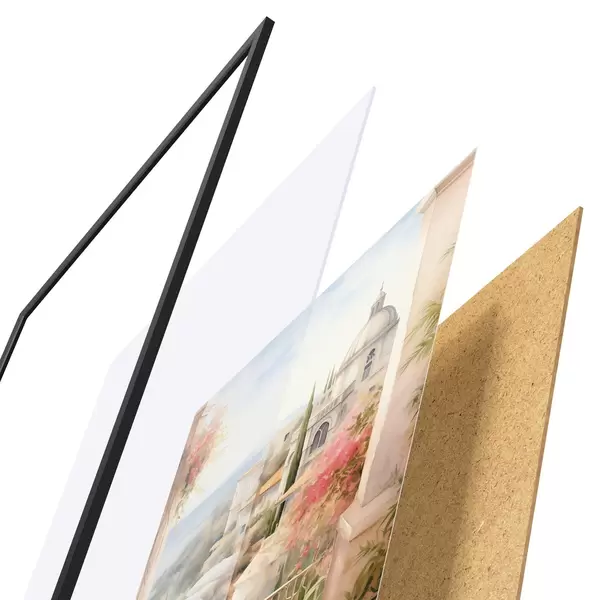Plagát sa skladá z rámu, plexiskla, vytlačeného obrazu a podkladu z drevotriesky. Plagát možno okamžite zavesiť na stenu vďaka úchytom na zadnej strane.