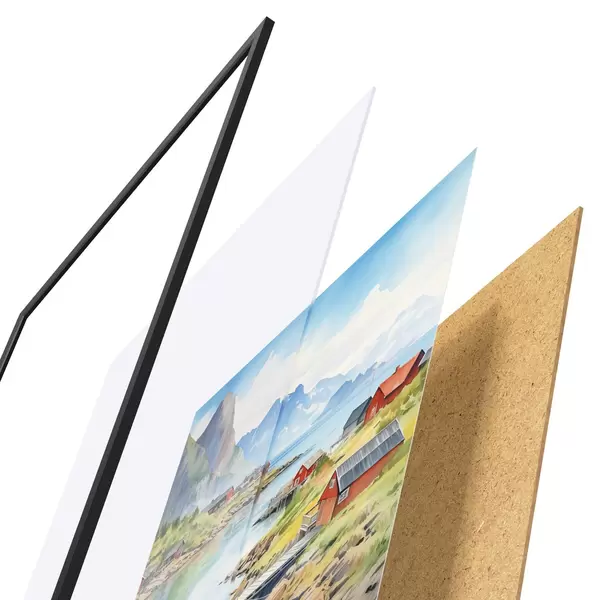 Plagát sa skladá z rámu, plexiskla, vytlačeného obrazu a podkladu z drevotriesky. Plagát možno okamžite zavesiť na stenu vďaka úchytom na zadnej strane.