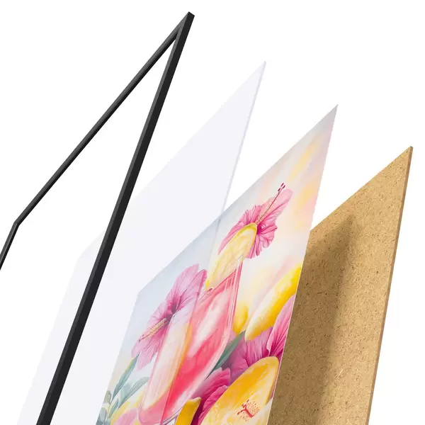 Plagát sa skladá z rámu, plexiskla, vytlačeného obrazu a podkladu z drevotriesky. Plagát možno okamžite zavesiť na stenu vďaka úchytom na zadnej strane.
