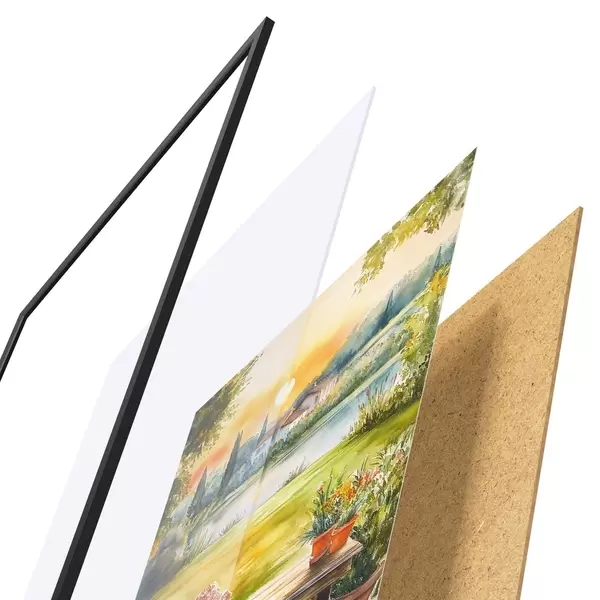 Plagát sa skladá z rámu, plexiskla, vytlačeného obrazu a podkladu z drevotriesky. Plagát možno okamžite zavesiť na stenu vďaka úchytom na zadnej strane.
