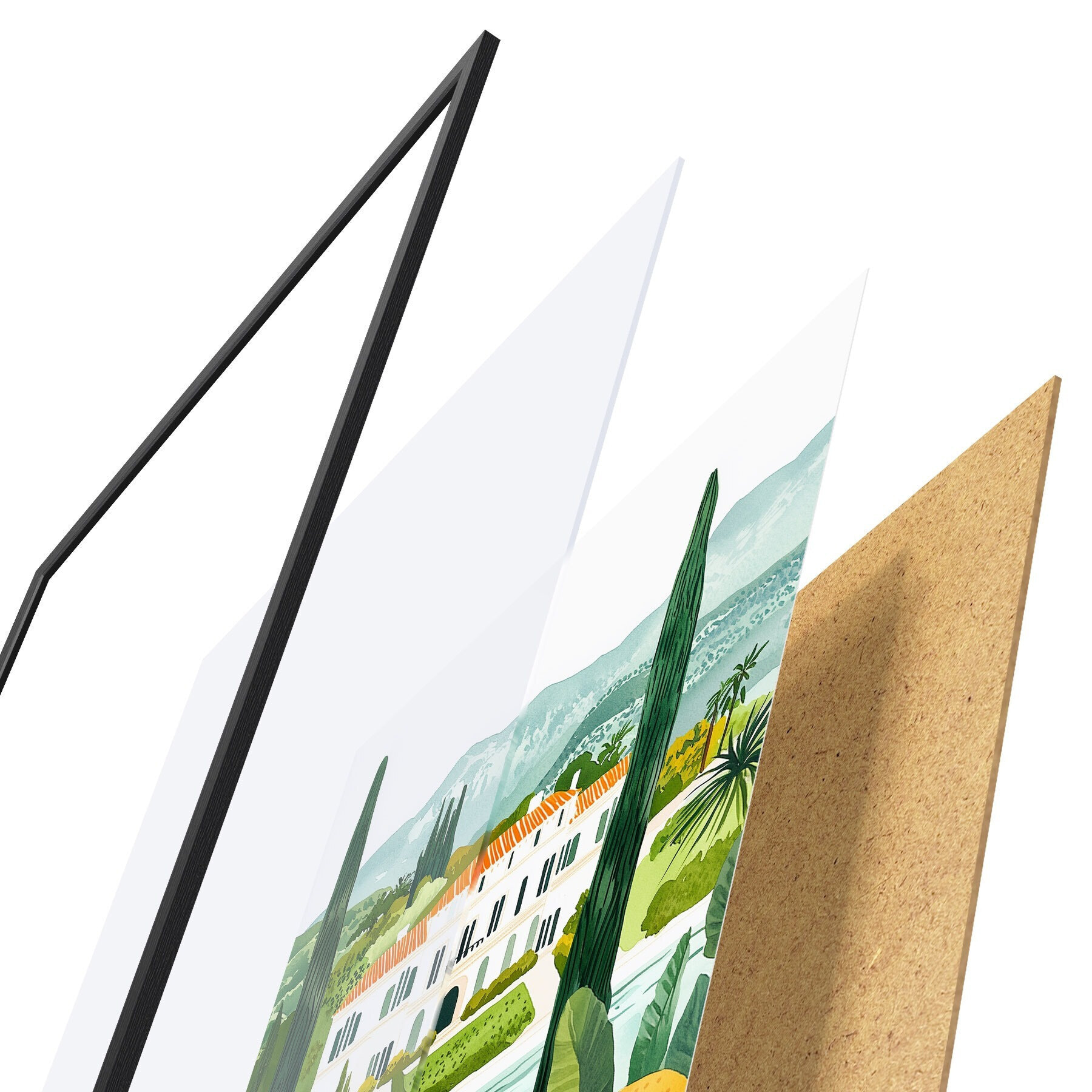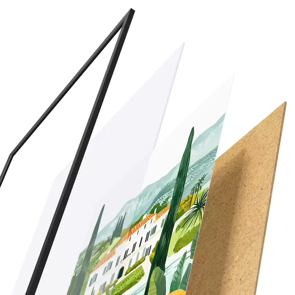 Plagát sa skladá z rámu, plexiskla, vytlačeného obrazu a podkladu z drevotriesky. Plagát možno okamžite zavesiť na stenu vďaka úchytom na zadnej strane.