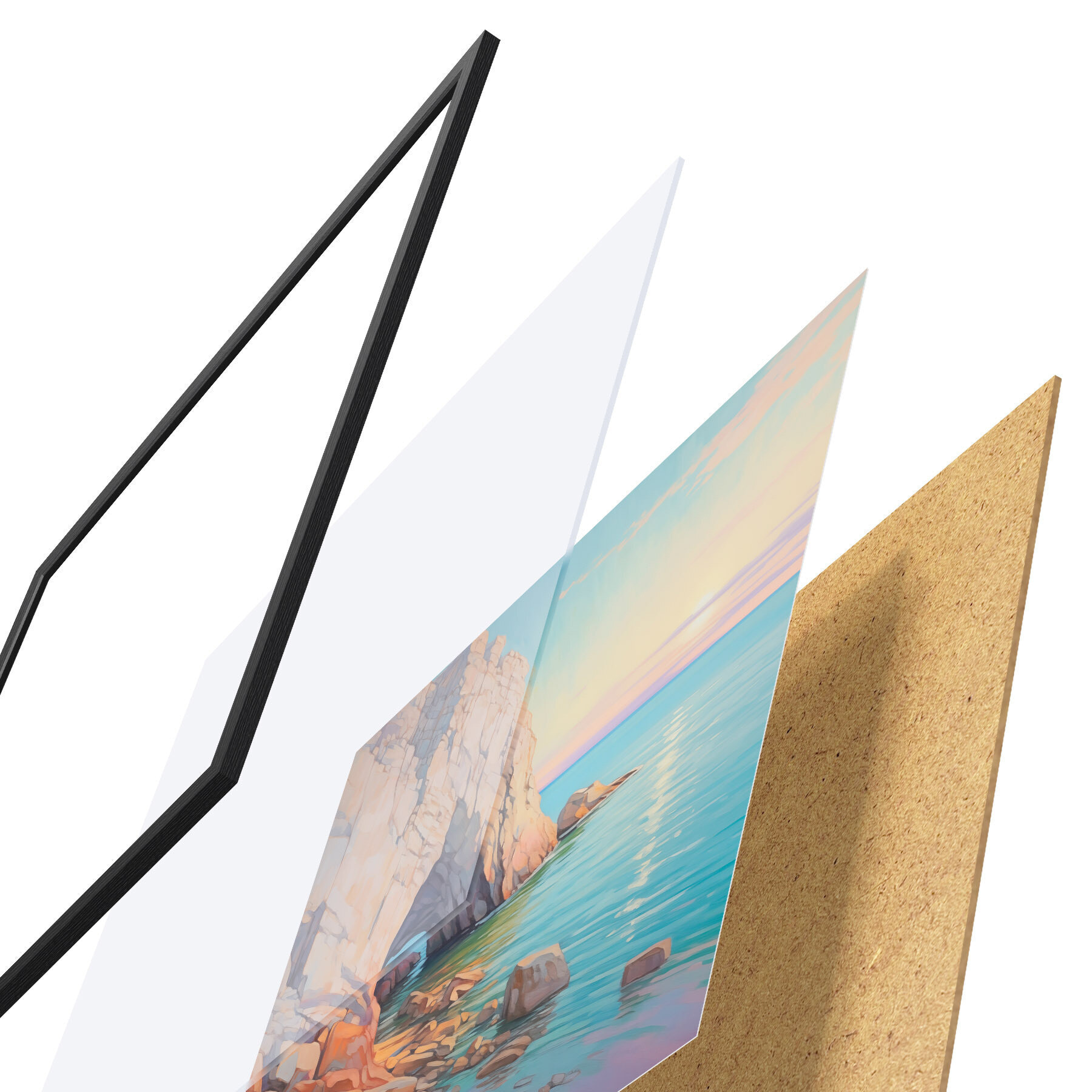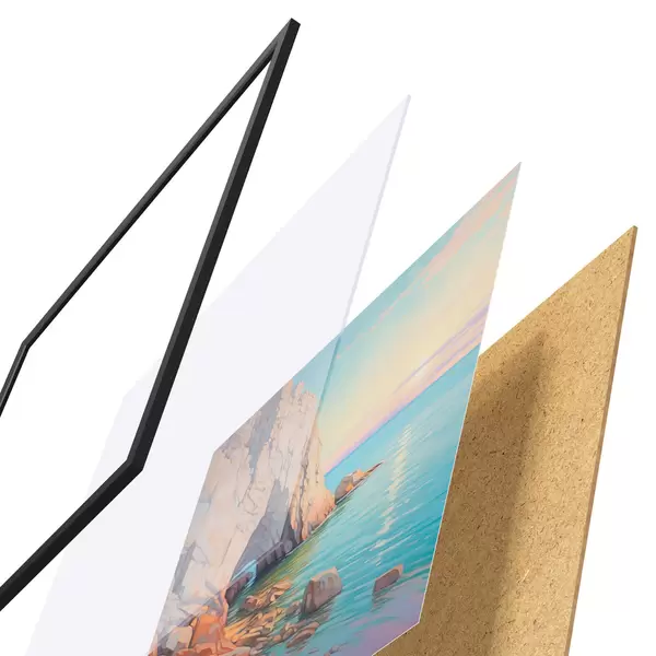 Plagát sa skladá z rámu, plexiskla, vytlačeného obrazu a podkladu z drevotriesky. Plagát možno okamžite zavesiť na stenu vďaka úchytom na zadnej strane.