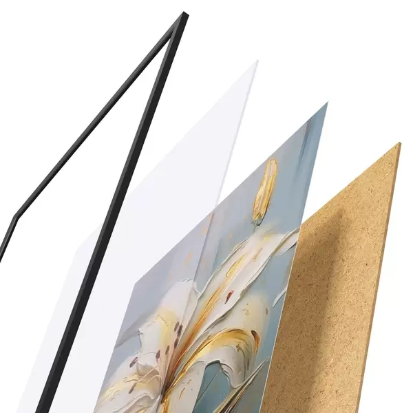 Plagát sa skladá z rámu, plexiskla, vytlačeného obrazu a podkladu z drevotriesky. Plagát možno okamžite zavesiť na stenu vďaka úchytom na zadnej strane.