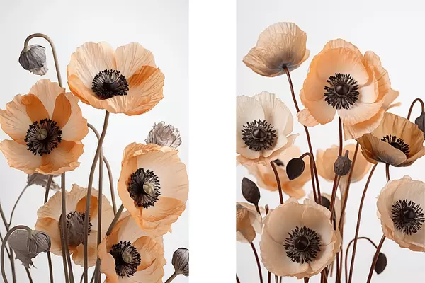 Plagáty Oranžové maky, sušené kvety na svetlom pozadí, mäkké osvetlenie, jemné okvetné lístky, kvetinová výzdoba Nr d00518