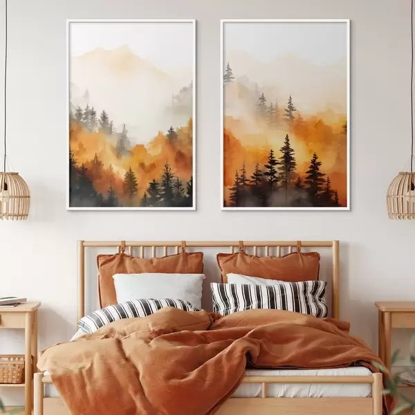 Plagáty Krajinomaľba akvarelom imitujúca les s vysokými borovicami a horami v pozadí Nr d00519