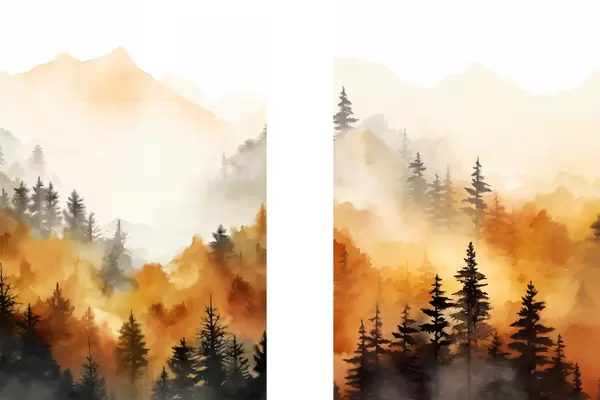 Plagáty Krajinomaľba akvarelom imitujúca les s vysokými borovicami a horami v pozadí Nr d00519