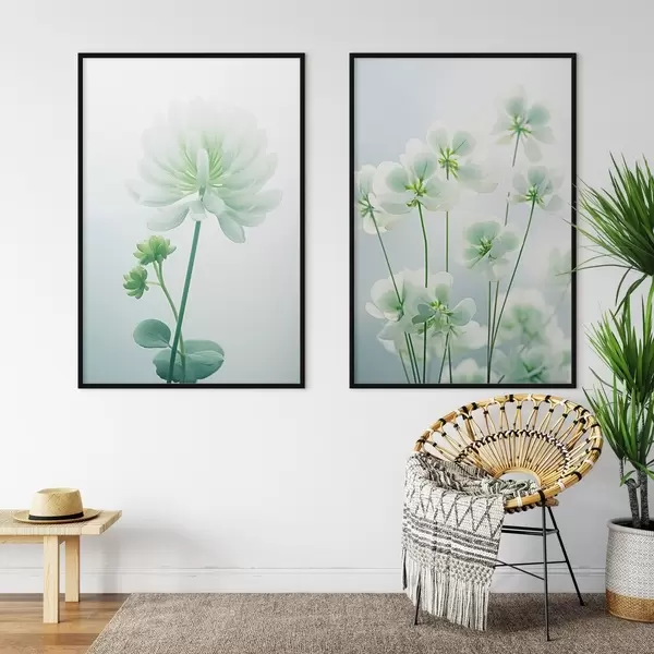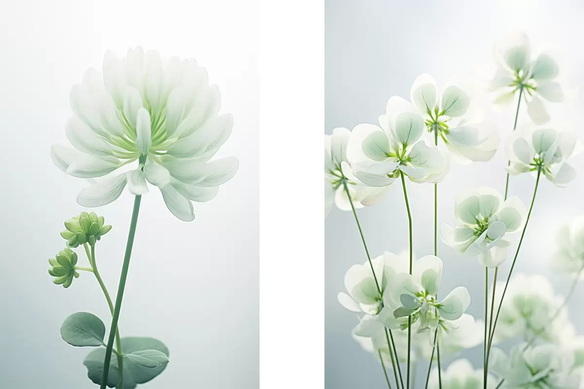 Plagáty Biele kvety ďateliny so zelenou stonkou a listami, mäkké osvetlenie, čisté pozadie, minimalistické zloženie, botanické Nr d00520