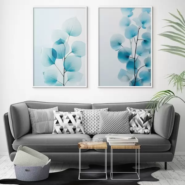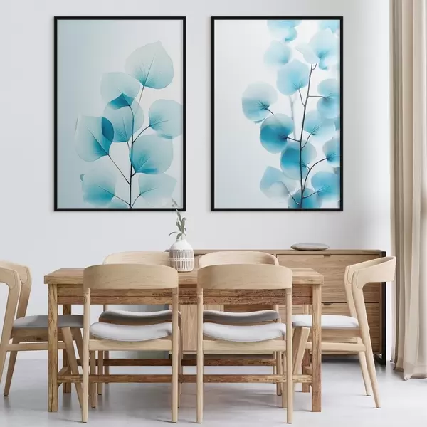 Plagáty Vetva s priesvitnými modrými listami, viditeľné jemné žilky, ľahká a pokojná kompozícia, minimalistická estetika Nr d00522