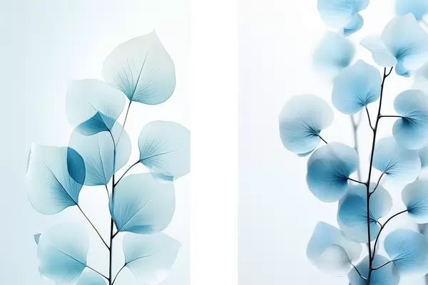 Plagáty Vetva s priesvitnými modrými listami, viditeľné jemné žilky, ľahká a pokojná kompozícia, minimalistická estetika Nr d00522
