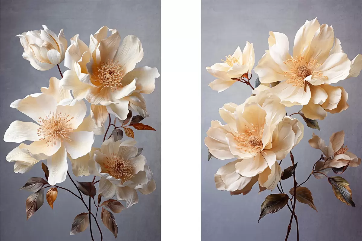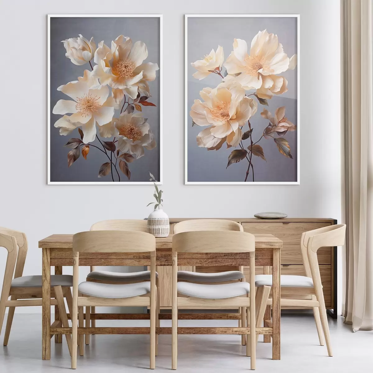 Plagáty Textúrované kvety s oranžovými piestikmi a oranžovými listami na sivom pozadí, mäkké svetlo, elegantné, detailné, realistické Nr d00525