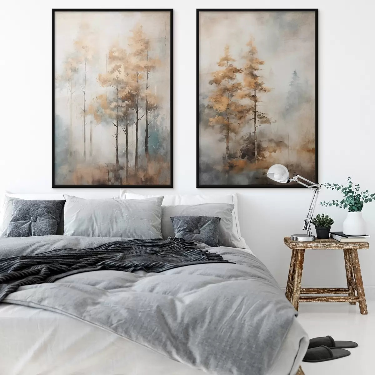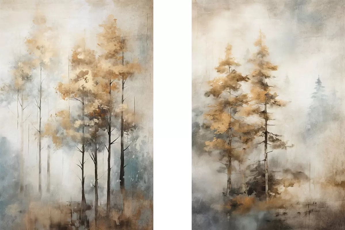 Plagáty Textúrované vysoké stromy so žltými listami v lese , pozadie je zmesou jemných modrých a hnedých tónov Nr d00528