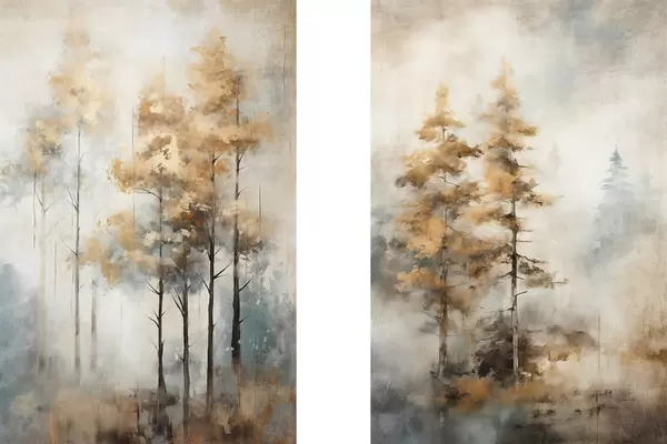 Plagáty Textúrované vysoké stromy so žltými listami v lese , pozadie je zmesou jemných modrých a hnedých tónov Nr d00528