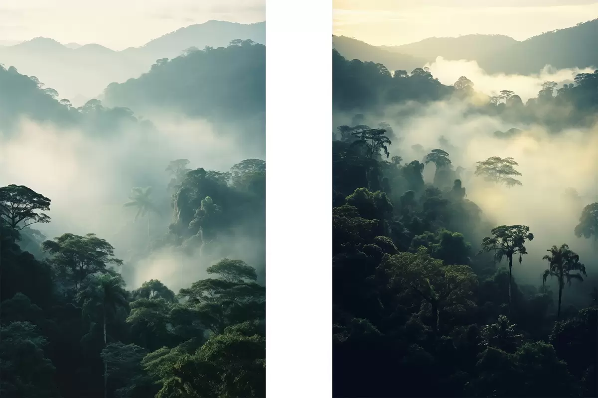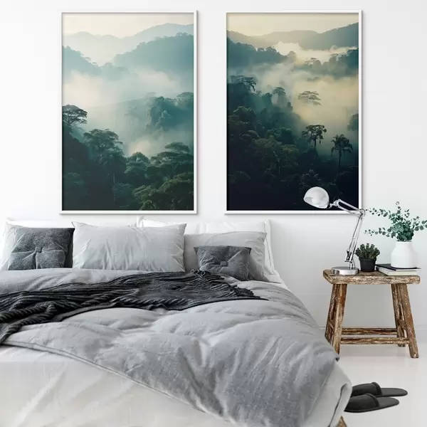 Plagáty Tropický dažďový prales so sviežimi zelenými stromami a hustou vrstvou hmly, ktorá vytvára atmosférické prostredie Nr d00529