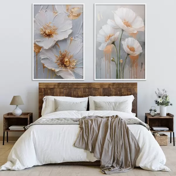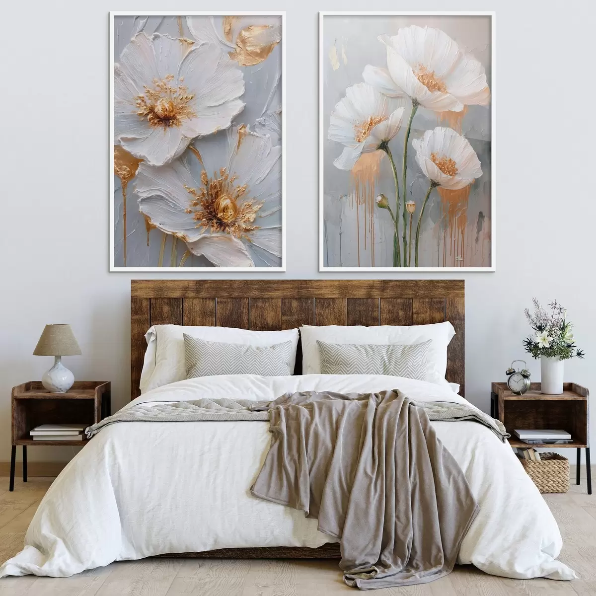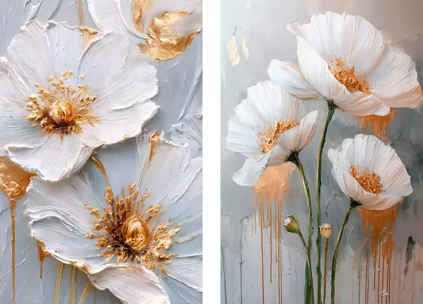 Plagáty Objemová maľba bielych kvetov so zlatými akcentmi na sivom pozadí Nr d00568