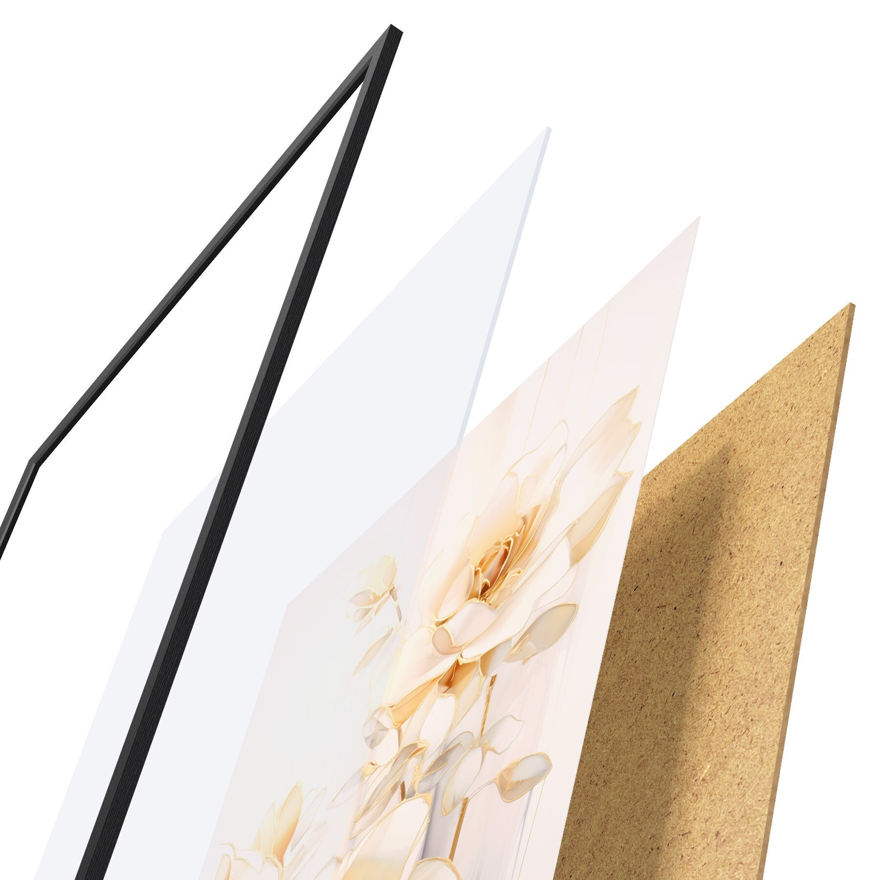 Plagát sa skladá z rámu, plexiskla, vytlačeného obrazu a podkladu z drevotriesky. Plagát možno okamžite zavesiť na stenu vďaka úchytom na zadnej strane.