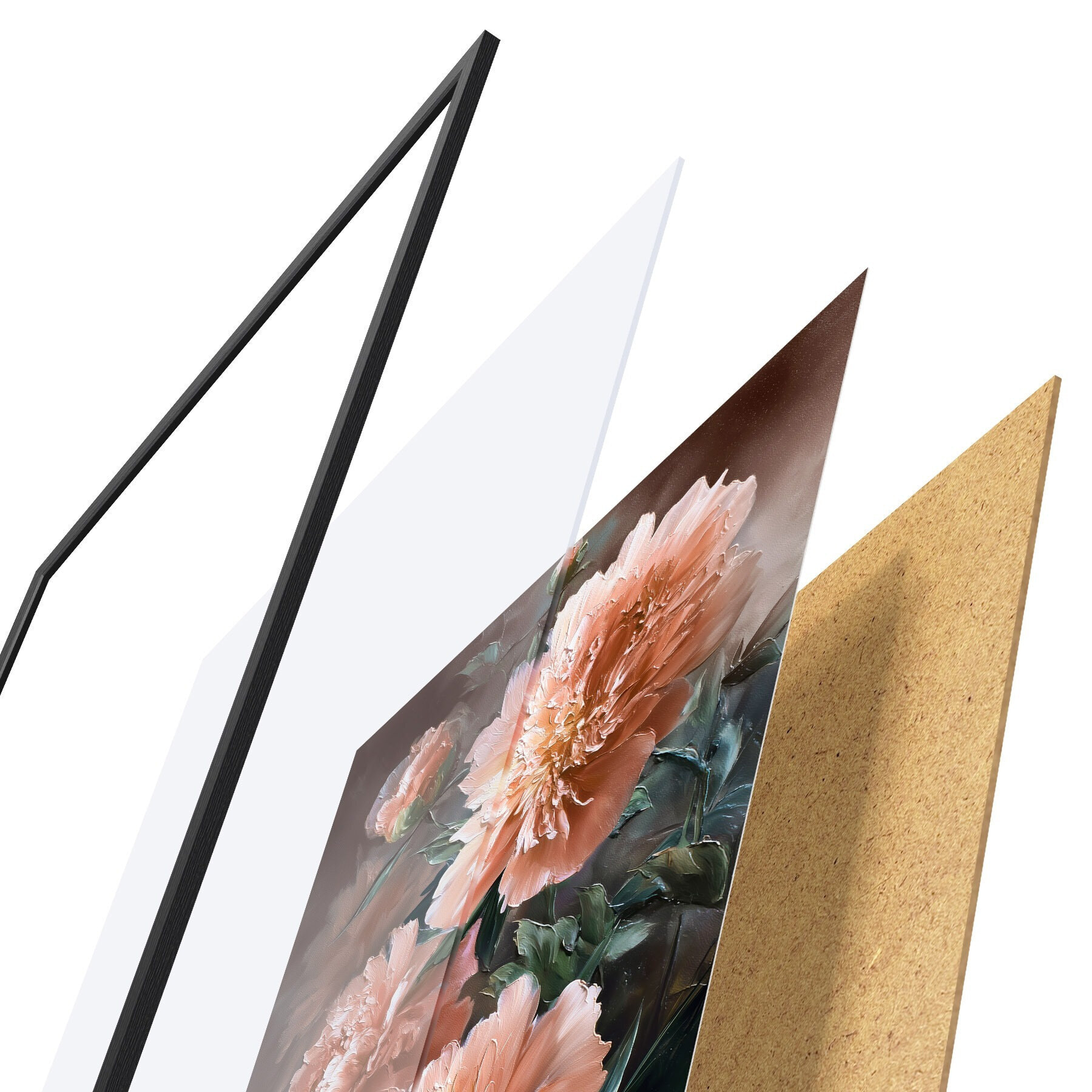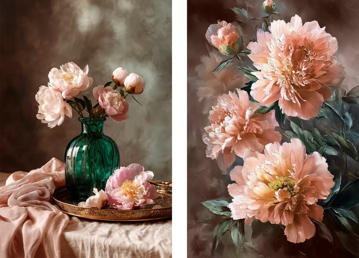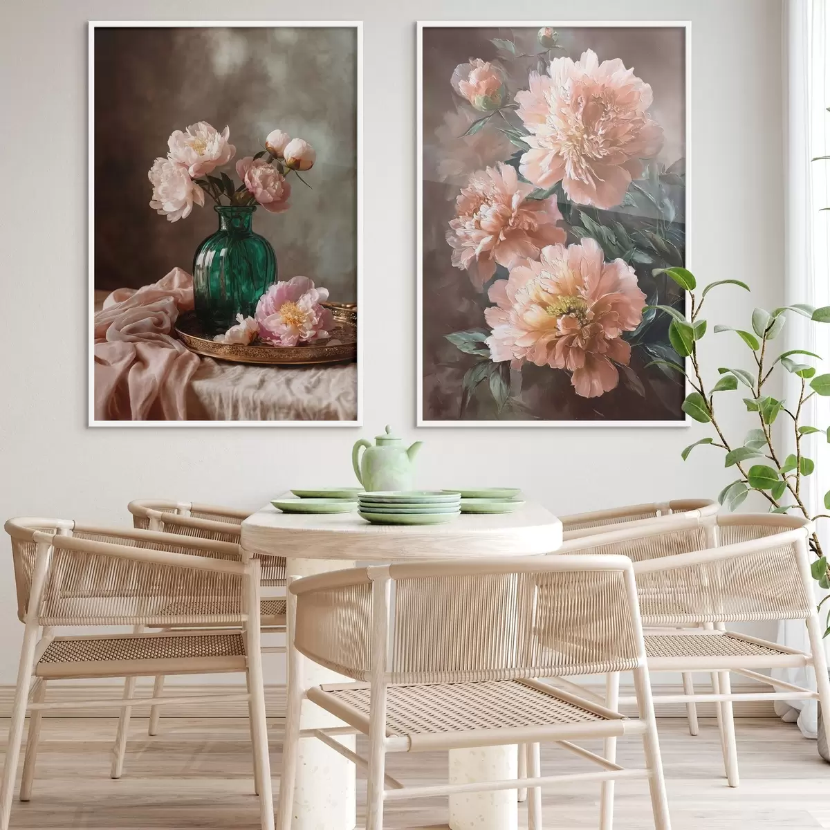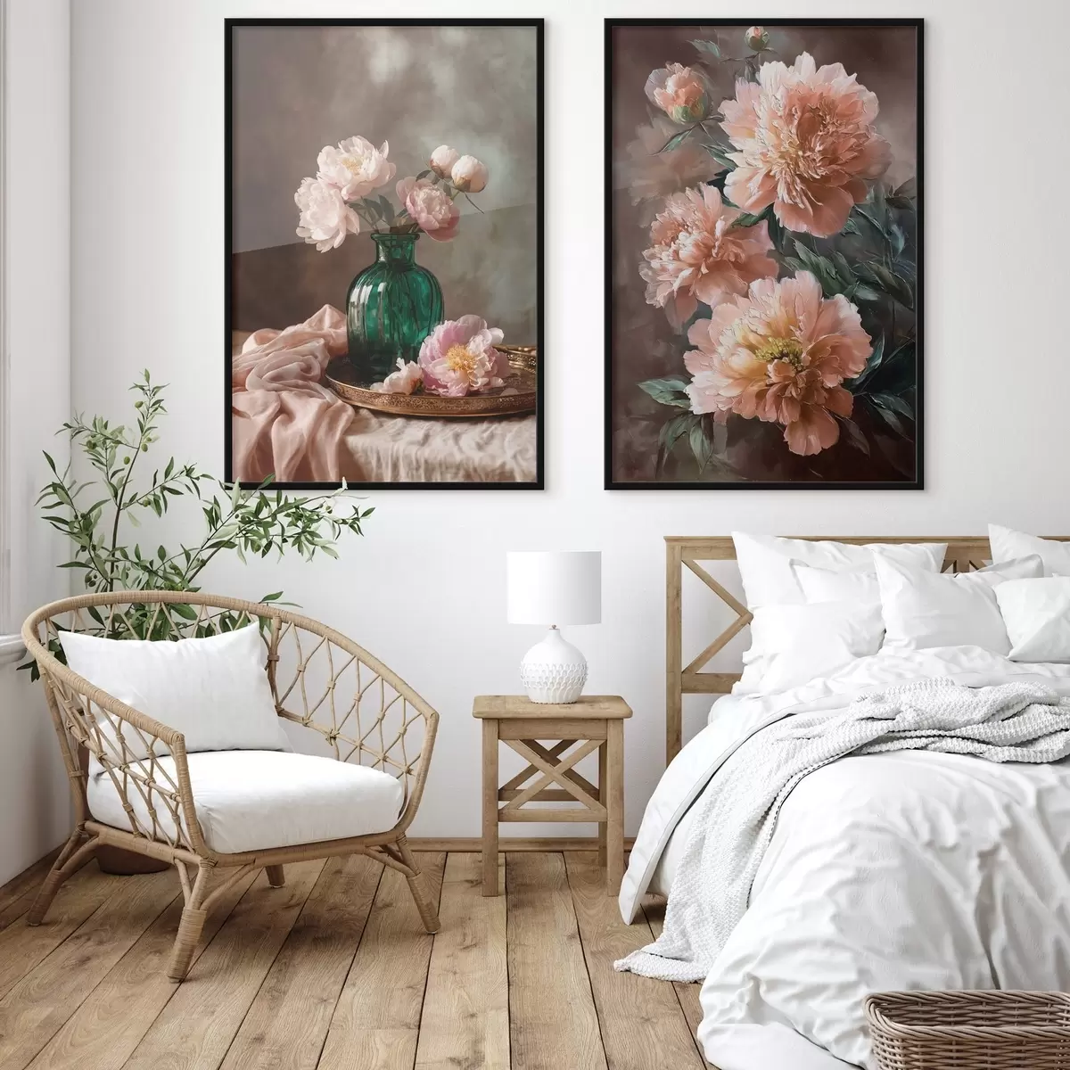 Plagáty Párová kompozícia s ružovými pivonkami vo váze a na plátne Nr d00578